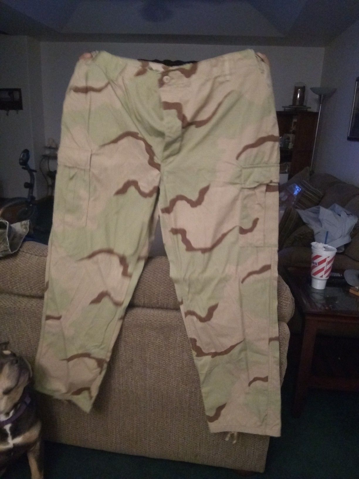 Men's camo pants button fly, size XX large, waist 43 to 47.