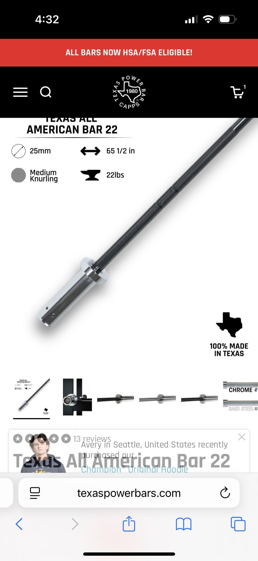 Will not reply to if available, just let me know your pick up time! Brand new in box Texas power bar All American 22lbs. Chrome finish. One of the best lighter bars on the market. https://texaspowerbars.com/products/texas-all-american-bar-22 Even on sale it’s $270 shipped, save yourself $40! Check out my other listings, I’ll do a discount if you buy multiple. Thanks for the interest.