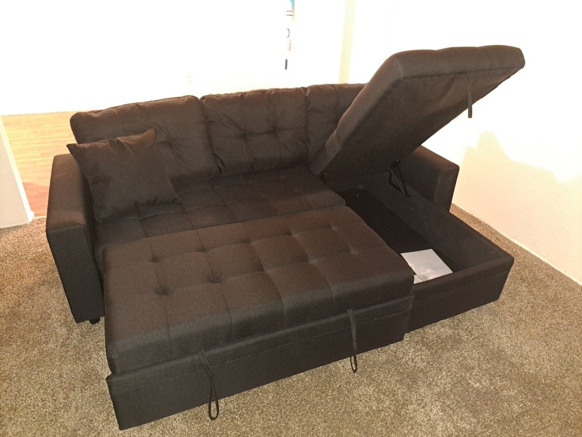 Black Linen Sectional Sofa W/storage Chaise And Pullout Bed