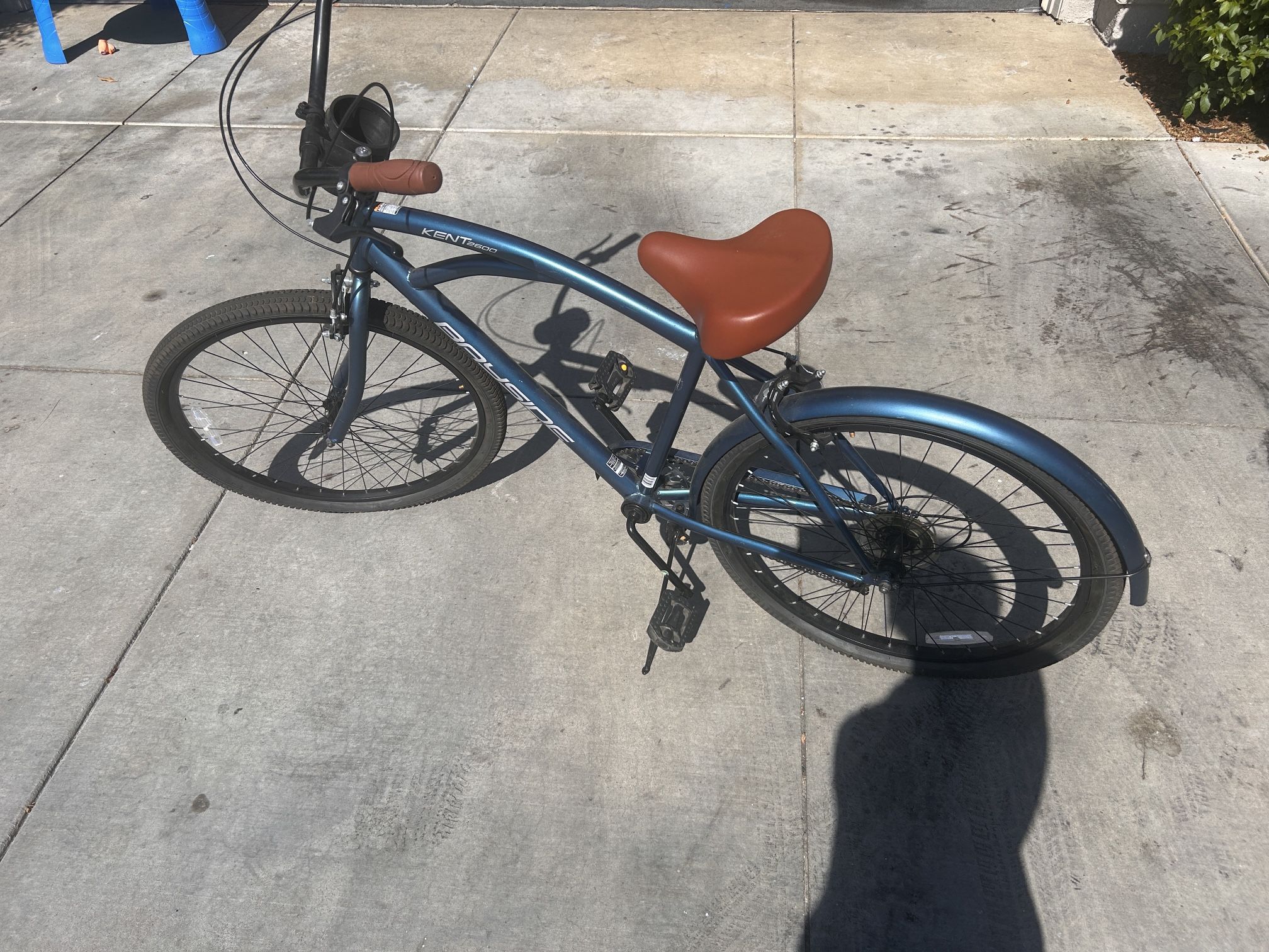 Brand new bike, bought online couple months ago and have used it at most twice. Shimano 7 gear shifter Front brake needs adjusting, just don’t know how Wheels currently flat from sitting, tubes are fine Small scrape on back fender