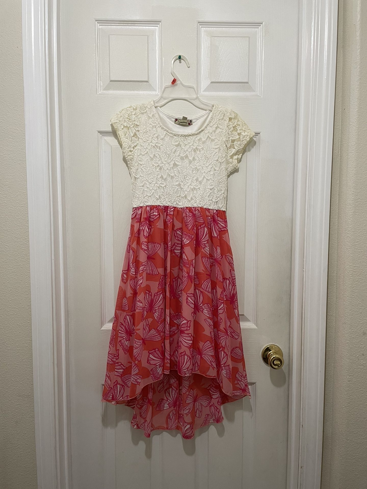 Girls dress, still looks like new. It has a beautiful floral design at the top, and has pink butterflies at the bottom. It’s great for the summer time. Size 14.