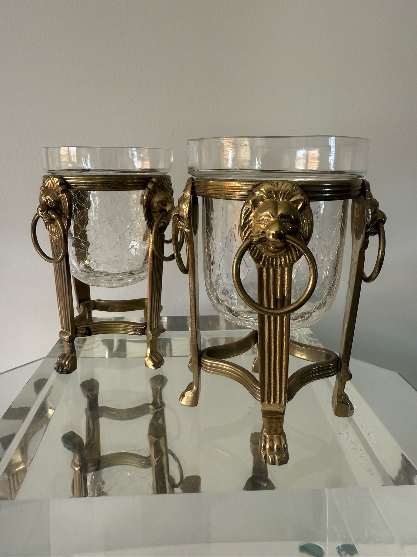 A Pair Of Elegant Vintage Brass Lion Head Votive Candle Holders with Crackle Glass Insert, Rare Like new Approximate height is 4.5”