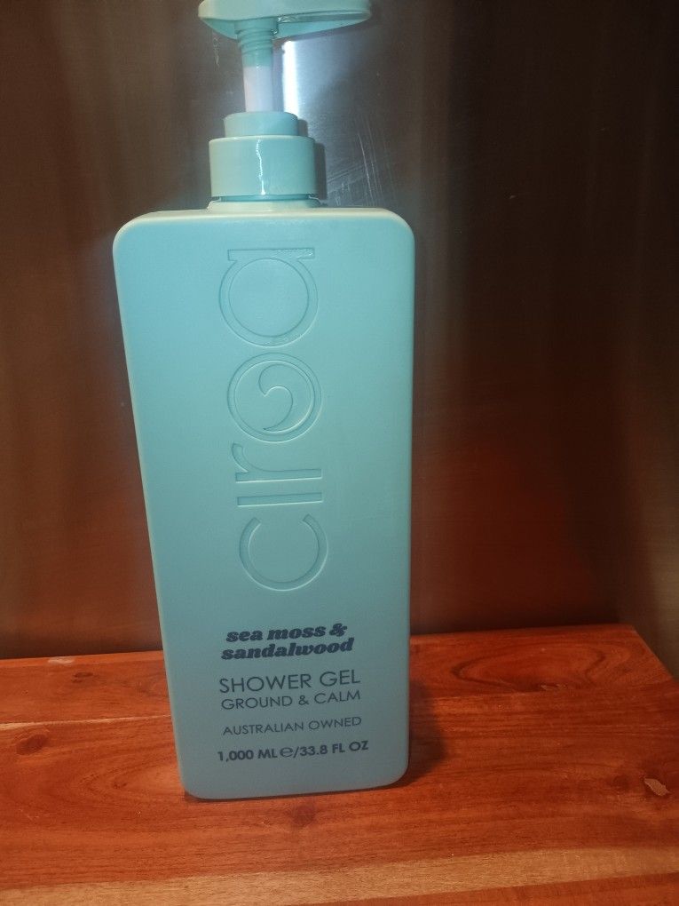 Circa Beauty shower gel in sea moss & sandalwood scent. It's a ground & calm formula. 1,000 ml / 33.8 fl oz.