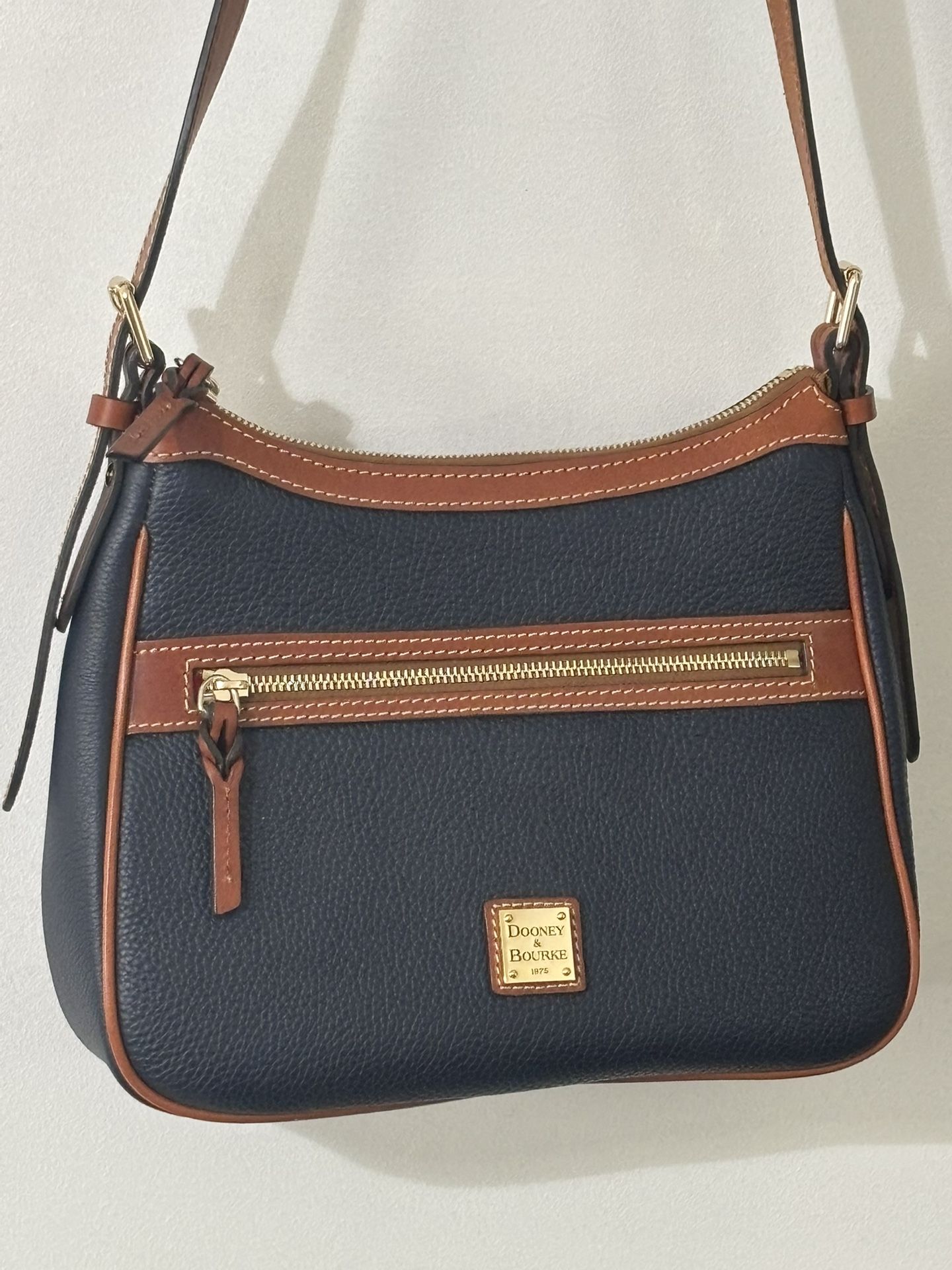 Beautiful navy and tan, pebbled leather, large crossbody, with classic D & B leather trim and red interior.