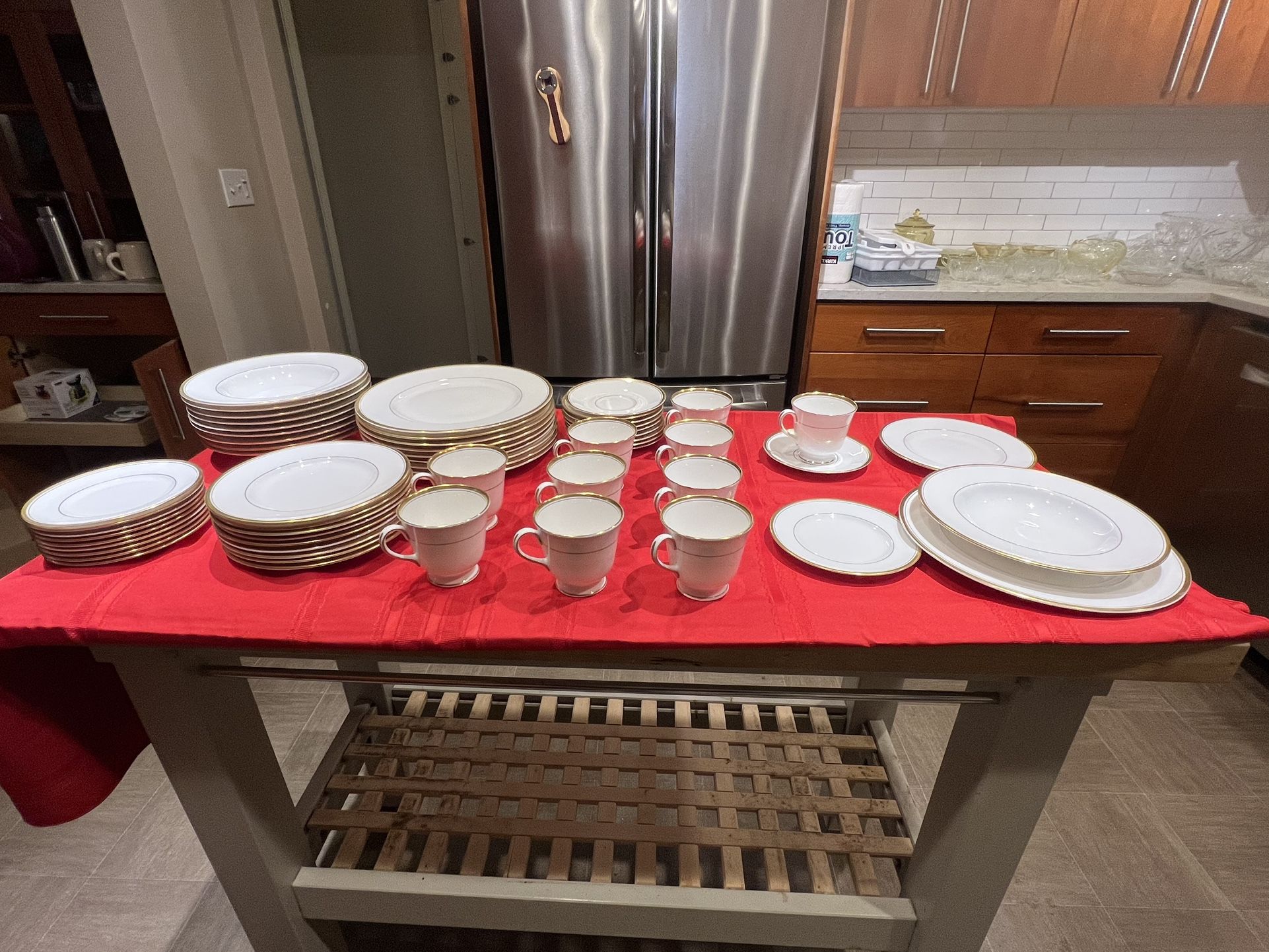 English bone China. In perfect condition: no chips, cracks, repairs, or crazing. Elegant gold rimmed. I have 2 sets of ten, containing dinner plate, soup bowl, salad plate, bread plate, cup and saucer. I’m selling each set separately or together. I also have a separate serving platter, oval serving bowl, sugar bowl, and a coffee creamer that I’m selling under a separate post. Willing to discount if you’re buying the full set.