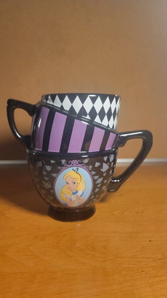 Disney Alice In Wonderland Triple Stacked Teacups Curiouser and Curiouser Mug. Good condition, it has a fee chips from paint on rim, otherwise in good condition. Disney collector piece.