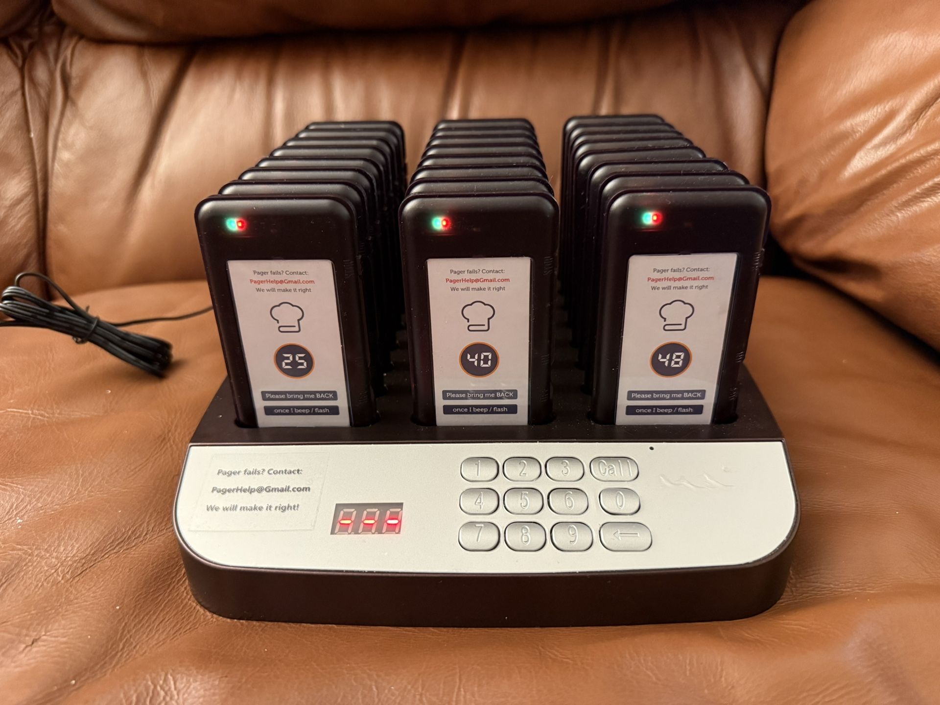 Set of 24 restaurant pagers numbered 25–48, all in excellent working condition. Barely used – almost like new. Each pager has been tested and works perfectly. Charging base is clean and fully functional. Ready to plug in and use right away.