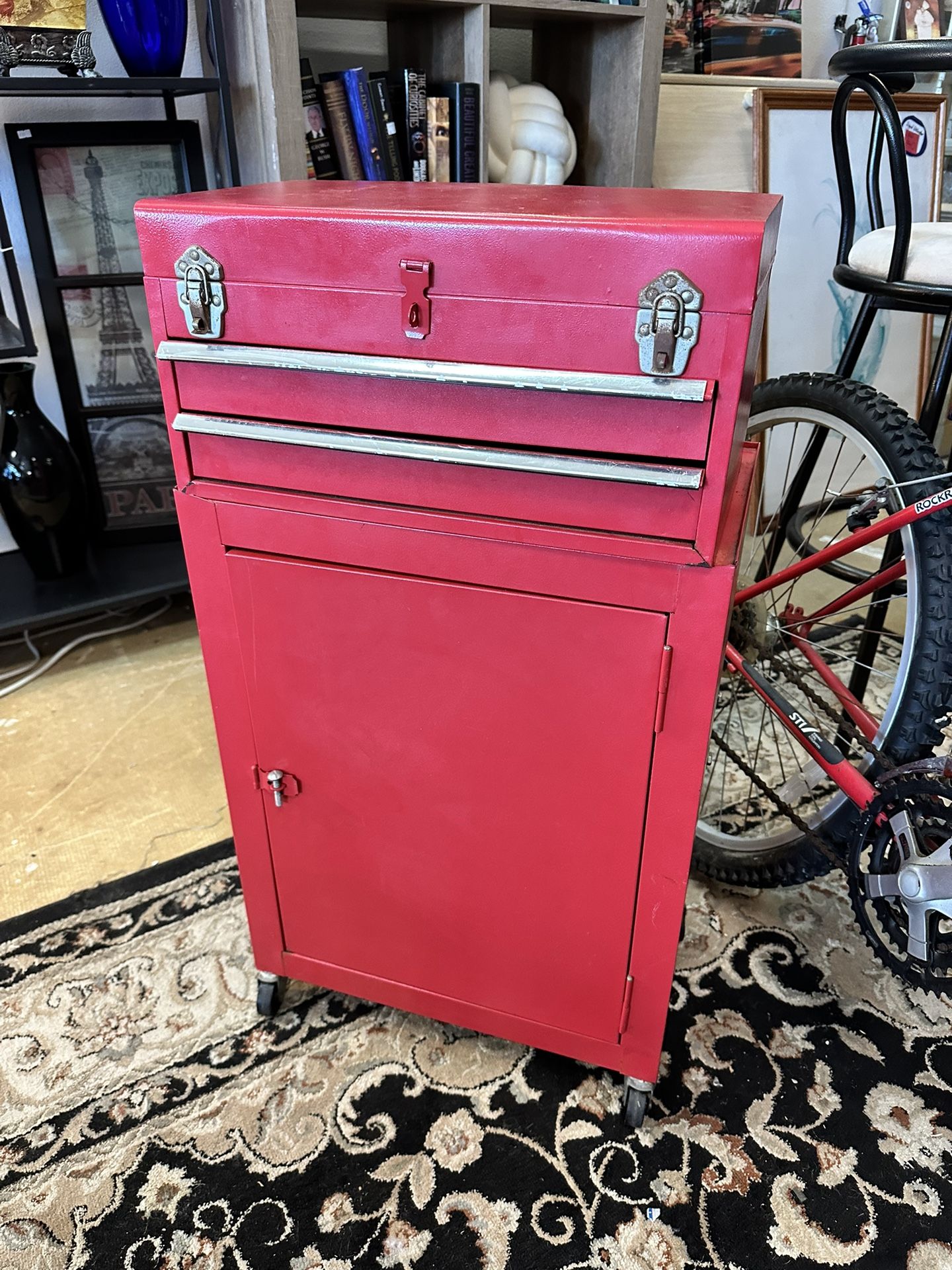 Sturdy red metal toolbox cabinet. Has a top compartment, two pull-out drawers, and a bottom cabinet. Bottom cabinet door has a pegboard inside. Rolls easy on casters. Visit Market Me Resale- where we have quality is used furniture, antiques, decor collectibles, and more. Located right next-door to Bronstein Auction Co in Longwood, FL. Here’s our address: 700 S US Hwy 17 92 Longwood Fl 32750. Hours: Mon-Wednesday 10 am-6 pm Thurs-Sat 10 am - 4 pm Closed Sunday