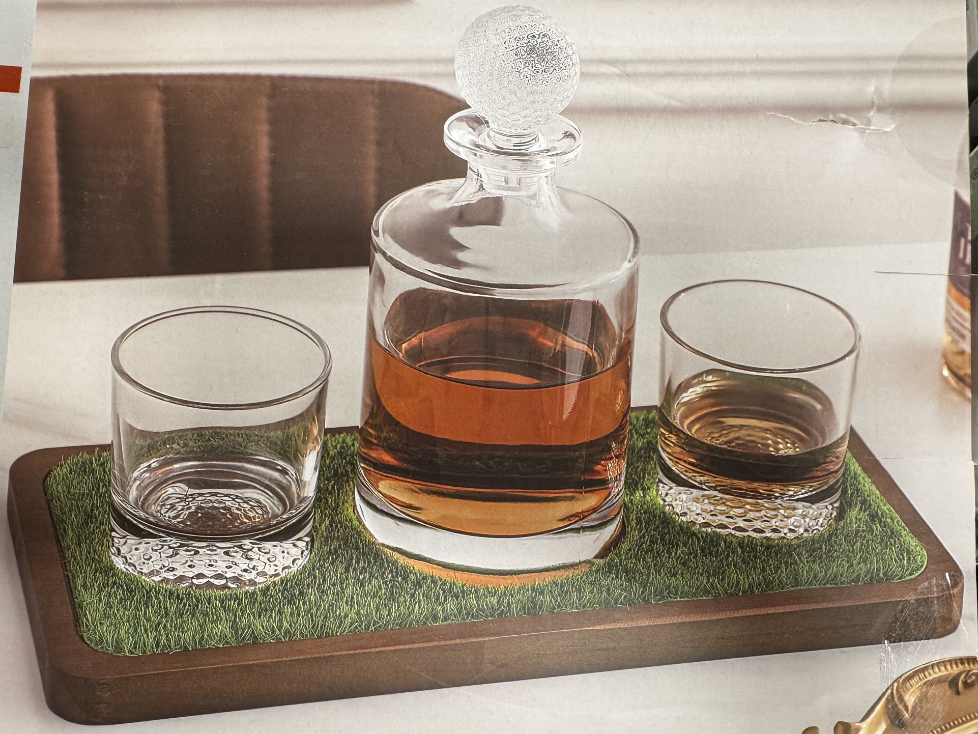 Whiskey Glass & Decanters set luxury golf style. 2Glass 1 decanter with lid. Wooden tray with turf grass layer. New in box. Gifted and never used. Original price $55+ tax Selling for $40
