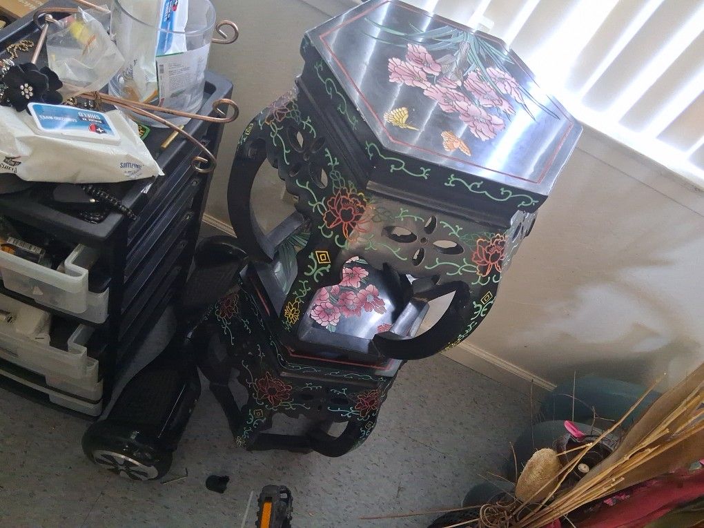 2 Vintage Black Laeguered Chinese Style Hexagonal Sidetable Or Stool.