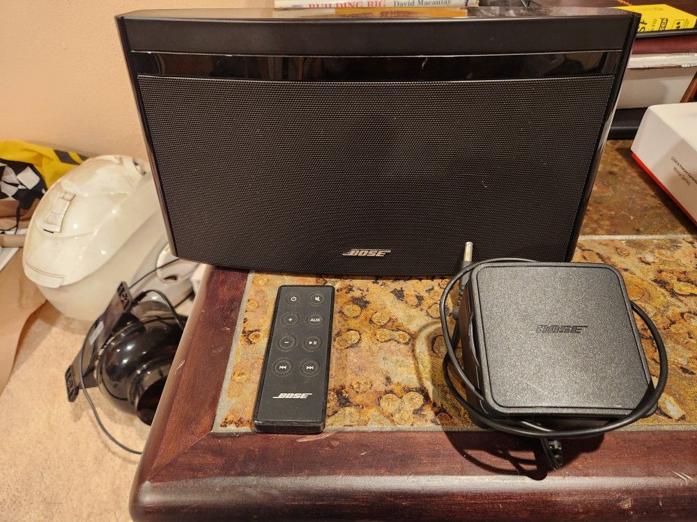 Includes Bose speaker, remote control, and power adapter. Especially good if you use it with an iPhone, but I no longer use an iPhone. (Bose model# 410633)