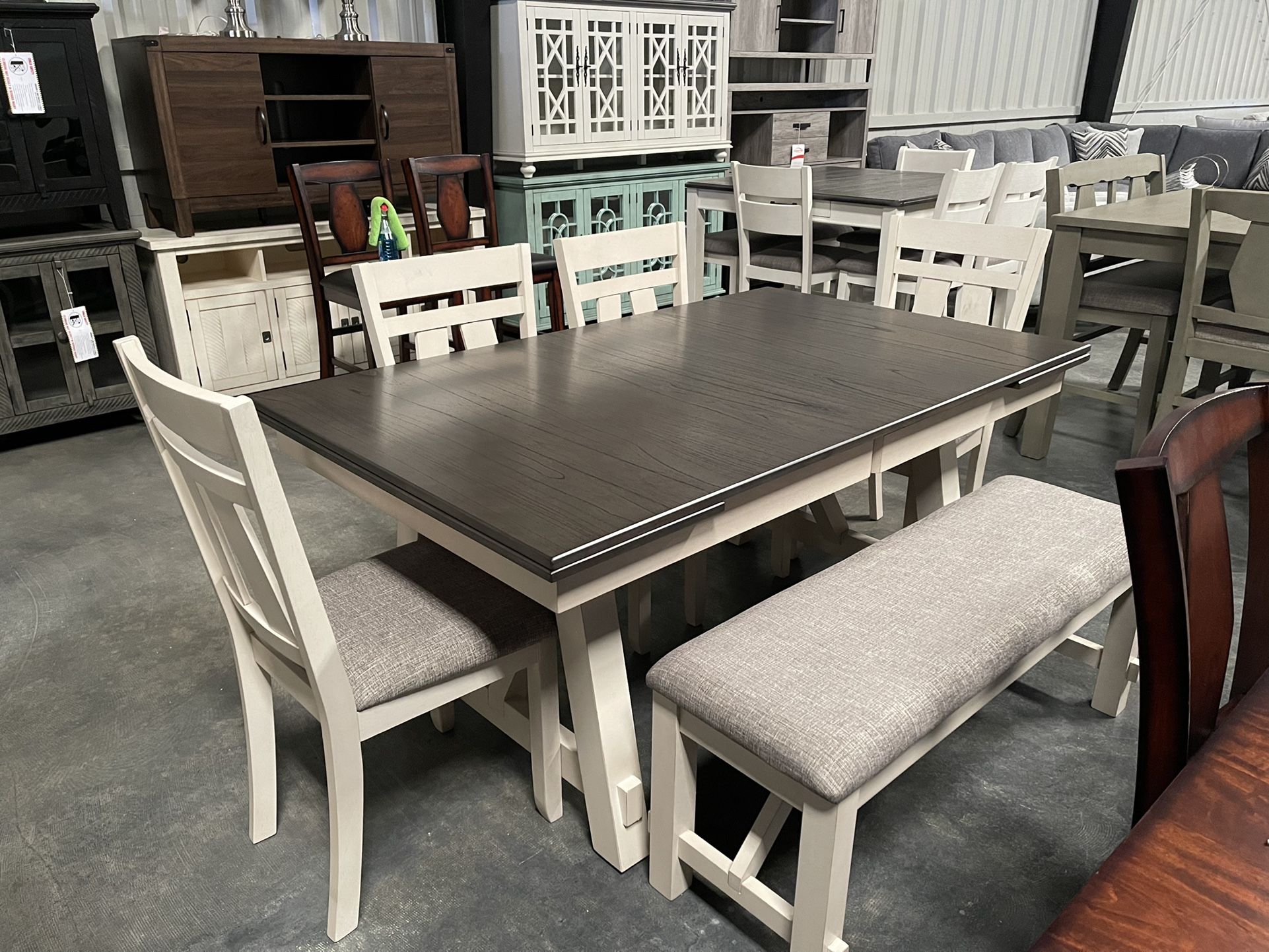 Includes table, 4 chairs and bench Located at Mirage Modern Furnishings 1021 Hume way Vacaville