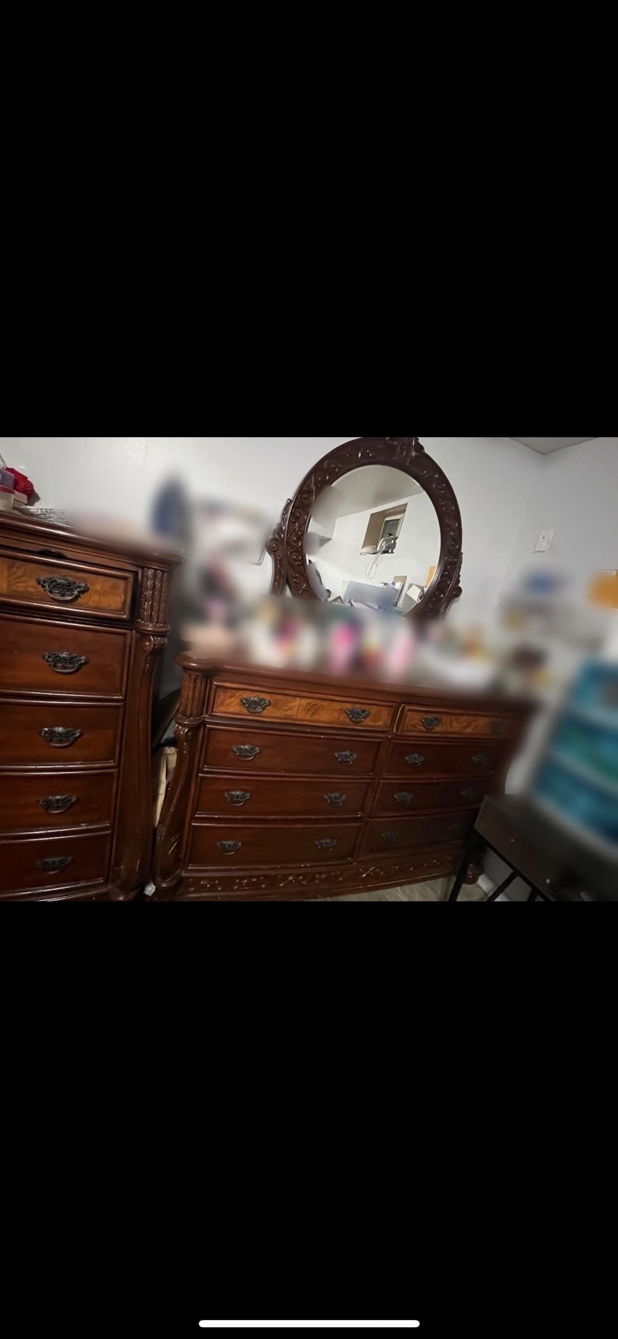 Real solid wood 4 pc bed set . Dressed Chest Night stand King bed Assemble ( will not disassemble) Moving need gone asap and serious buyers