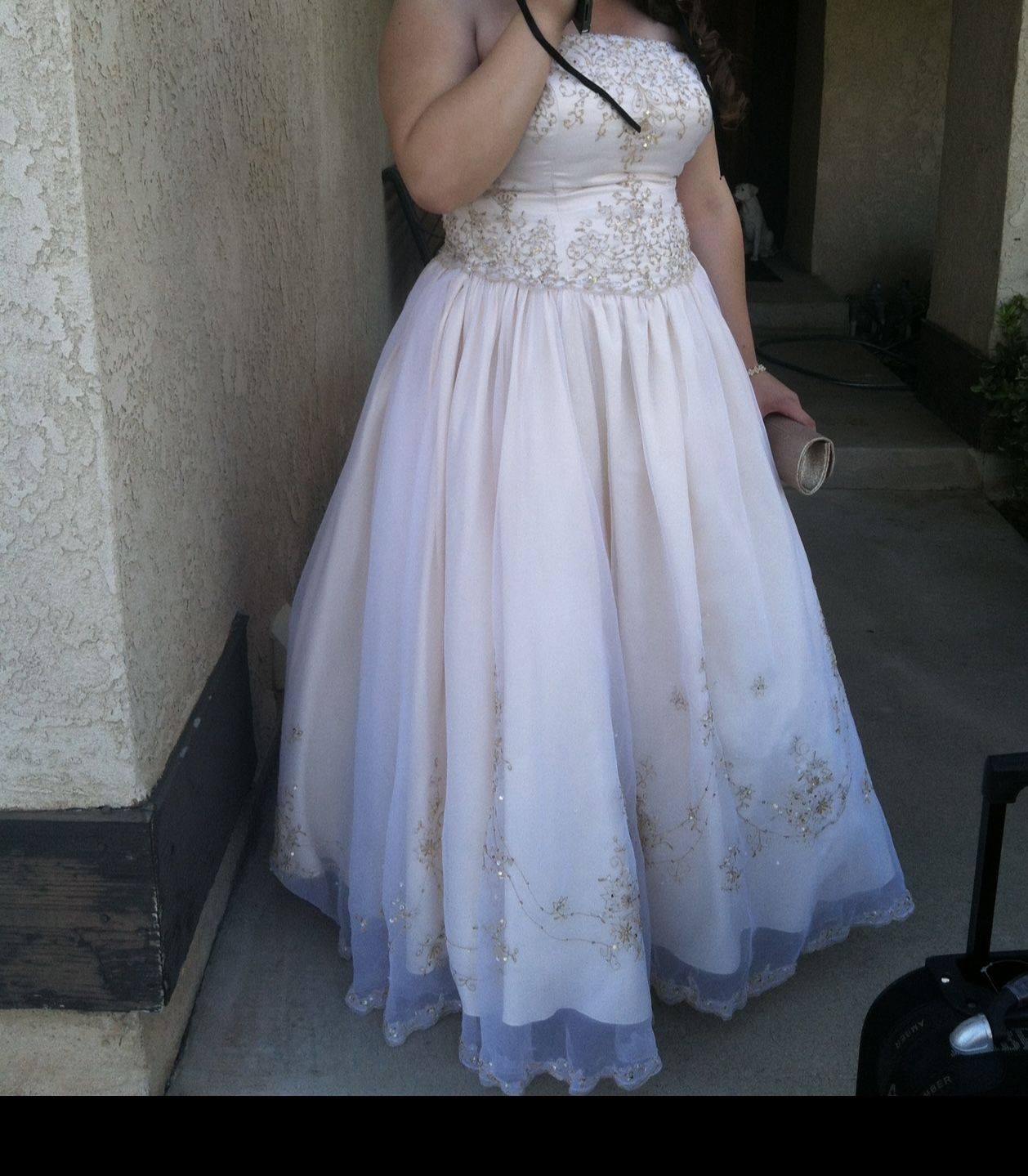 Champagne Colored Prom Dress Beading on Top & Bottom Princess Style Ballgown Strapless or With Straps Corset Back Size 16/18 Worn Once in 2013 For Prom! Needs To Be Dry Cleaned.
