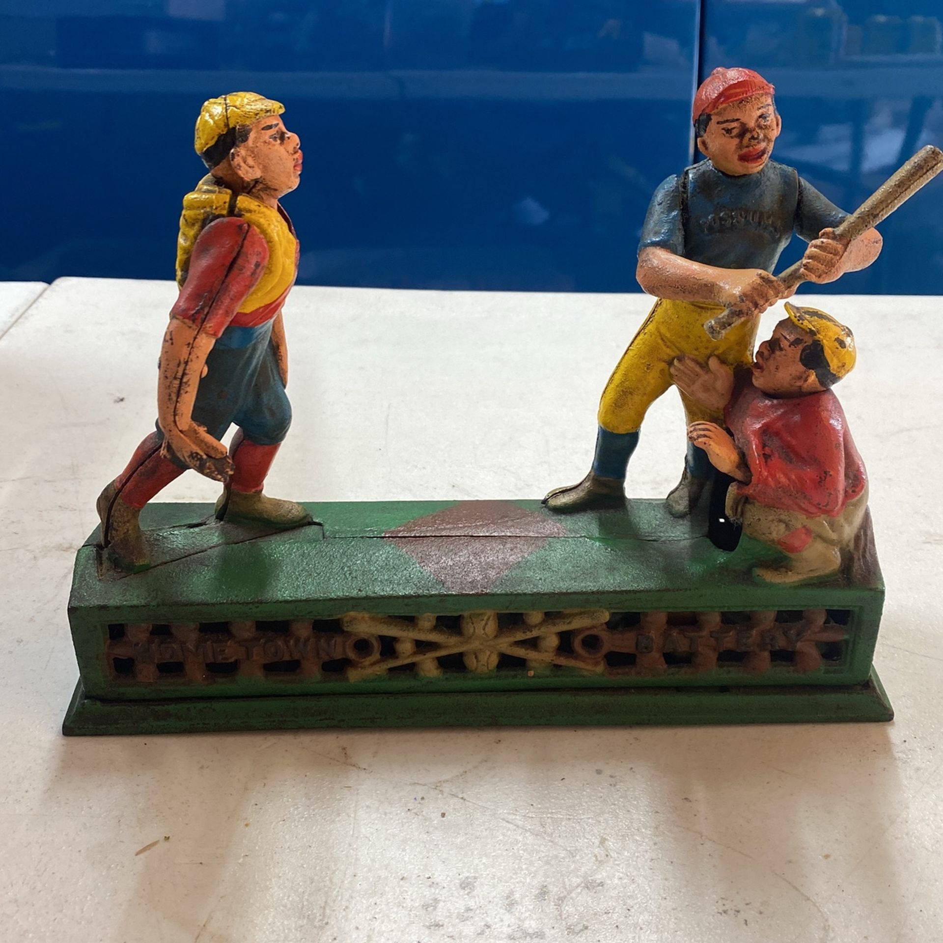 Vintage Antique 1900s Cast Iron Hometown Battery Baseball Coin Bank Americana, 9 1/2"L x 7"H,