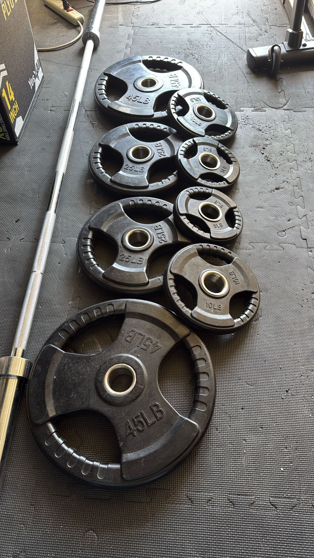 45lbs olympic barbell(perfect condition) Plates 45lbs pair 25lbs pair 10lbs pair 5lbs pair