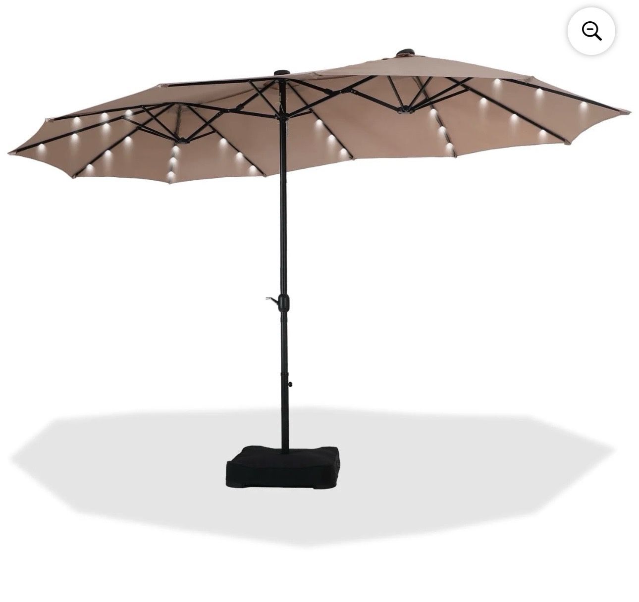 F391 Summit Living 15ft Double-Sided Solar Patio Umbrella with Base (Included) Large Outdoor Umbrella with Solar Lights Beige EXTRA LARGE SHADE: 15ft double-sided patio umbrella has a larger shade area than conventional umbrellas, adequately cover multiple lounge chairs and large rectangular tables. Perfect for casual gatherings with family and friends. PREMIUM CANOPY: Made of high-quality 220gsm solution-dyed fabric with UPF50+ anti-UV coating provides 3-year fade-resistant, 99.9% UV-resistant, and water-repellant properties. Effectively blocks harmful UV rays including UVA and UVB to protect your health. SOLAR LIGHTING SYSTEM: Built-in 48 solar LED lights. Light up the night for your family and laugh and play under the warmly lit umbrellas in the backyard, provide your family with a harmonious and warm night atmosphere. 4800mAh solar panel provides up to 10h running time when the battery is fully charged. DURABLE STEEL ALLOY FRAME: 12 heavy-duty steel alloy ribs with 20% thickened (12x18mm), work in conjunction with three vents at the top of the umbrella to circulate air which provides superior umbrella surface support and balance to reduce shaking. The diameter of umbrella pole is 1.9 inches, please check the hole diameter of your outdoor table before purchasing to ensure and fits the umbrella. EXCELLENT ANTI-RUST PROPERTY: Upgraded steel alloy umbrella pole and ribs are more anti-rust than traditional iron materials. Double powder-coated steel alloy surface brings superior rust resistance. Double protection prolongs the life of the umbrella. EASY CRANK: Smooth crank system ensures that opening (clockwise) and closing (counterclockwise) the patio umbrella can be easily accomplished in seconds. Reinforced zinc alloy tilting mechanism has 1.5X the hardness and 2X the tensile strength than the aluminum alloy material, and the service life can be doubled. BASE INCLUDED: No need to buy a separate base. HOMSHADE base supports easy installation and portable storage of up to 138 pounds. TIPS: Sand not included, for the stability of the umbrella, please fill up more than 50lb sand for each sandbag. USE AND MAINTENANCE: HOMSHDE 15ft rectangular outdoor umbrella widely used in backyards, decks and commercial scenarios. The extra-large umbrella canopy acts like a big tree, providing a cool shaded area for your family. Please close the patio umbrella and tie it with the strap to keep it in optimal condition and extend its service life in extreme weather such as strong winds or when not in use. HOMSHADE umbrella base is effortless to install and conveniently portable for storage, weighing up to 138 pounds. Tip: No sand. To ensure the stability of the umbrella, fill each sandbag with no less than 50 pounds of sand or stone.