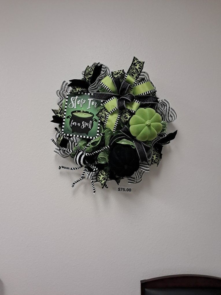 Halloween reef, 26", Colors include black/white, lime green. Had cardboard "Stop in for a spell", spider, pumpkins, ribbons and bows. I am selling this reef for $75 firm!!!
