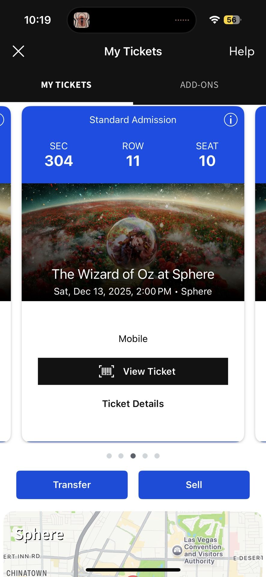 I have 2 tickets for the wizard of oz show at the sphere tomorrow Saturday Dec 13 at 2pm We can’t make it due to an emergency. Section 304 Row 11 Seat 10 and 11 Face value of tickets are $164 each $25 dollar parking pass also available. Will transfer tickets through Ticketmaster app.