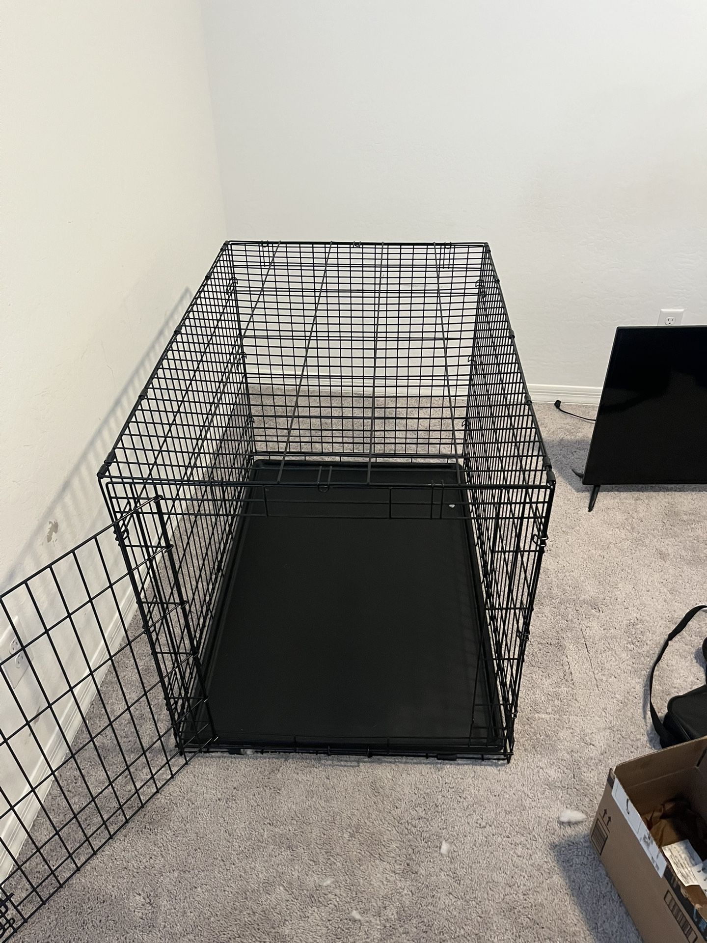 Easily collapsible, removable plastic tub bottom which is easy to clean. Dog not included! He’s 40lbs with plenty of room. 42L x 28W