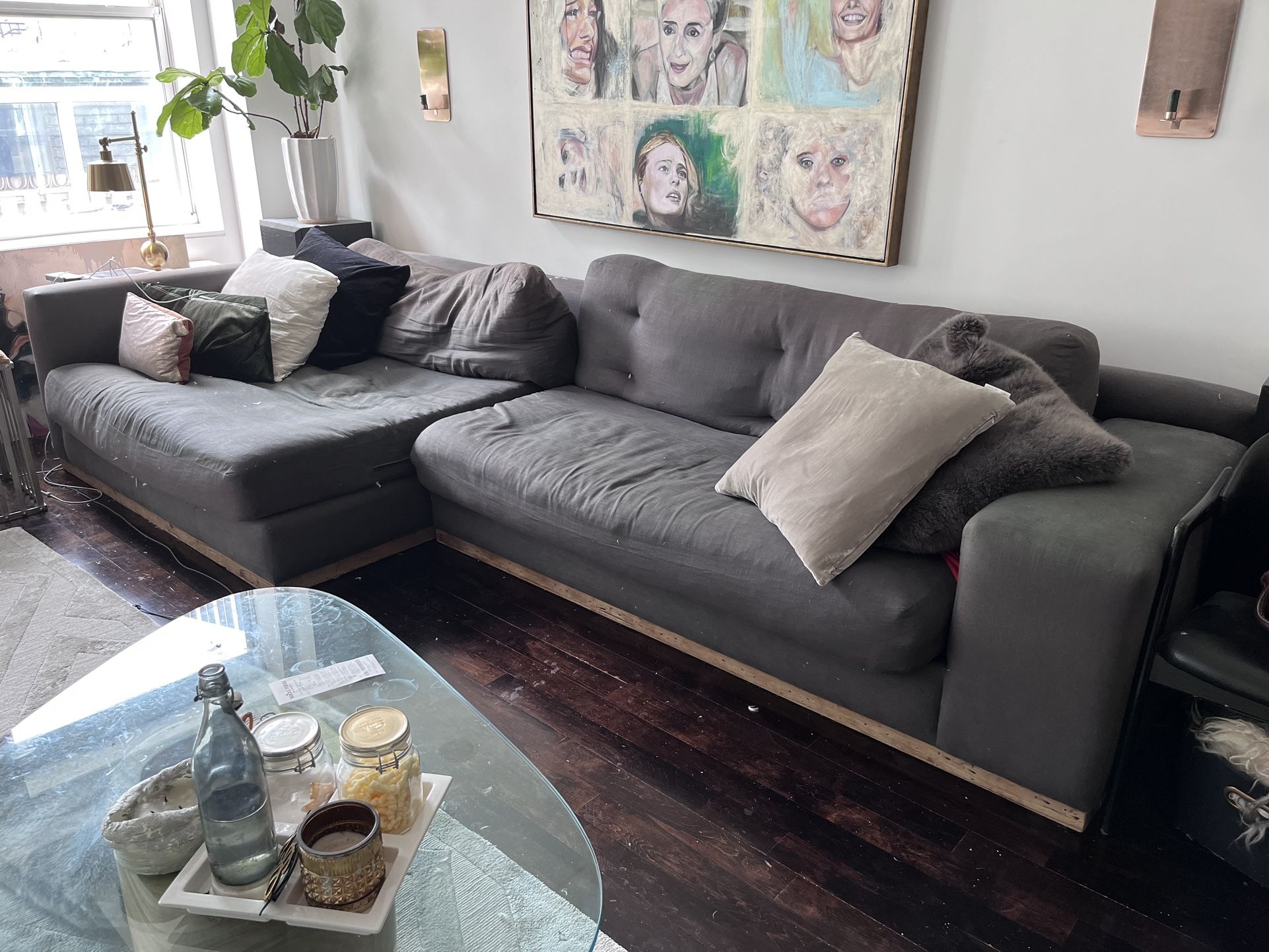 This is an enormous sectional originally purchased on sale for $6,000. It’s extremely sturdy and heavy but as you can see from pics, it has been lived in. The main issue is sun discoloration and some staining from use by a family with youngsters. Extra pillows shown not included. Must sell fast. Open to offers, just need pickup by Wednesday March 10th. May be able to coordinate with movers and transport curbside outside my condo building for pickup. This option would only be available on May 10th.