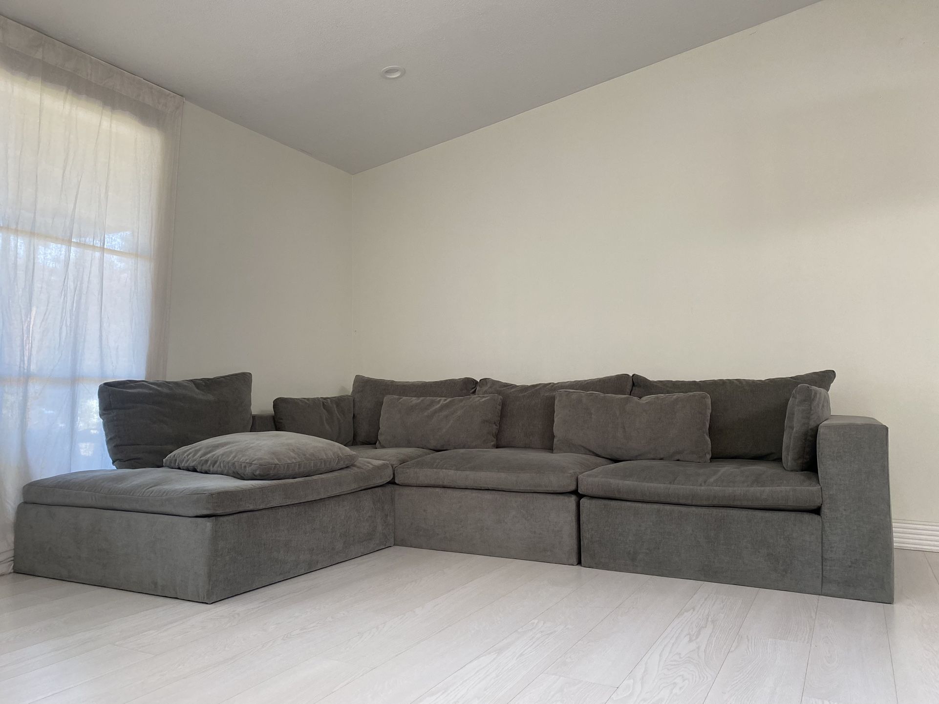 Originally cost $6,000. West Elm Harmony modular modern sectional couch and ottoman in a luxurious gray. With undertones of green. West elm version of the cloud couch. Extra deep seats. For maximum comfort. 122”x 43”. Down feather filled. Most comfortable couch I’ve sat on. Smoke and pet free home. I can deliver for an extra fee.