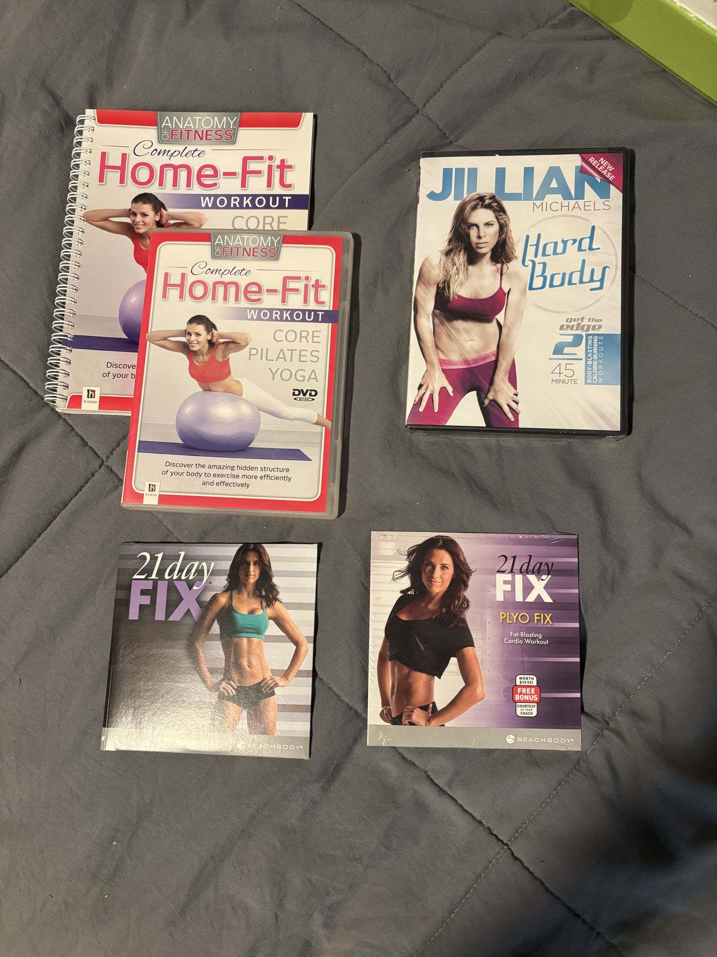 Set of fitness DVDs and books featuring workout programs. Includes various exercise routines for home fitness. Cross posted.
