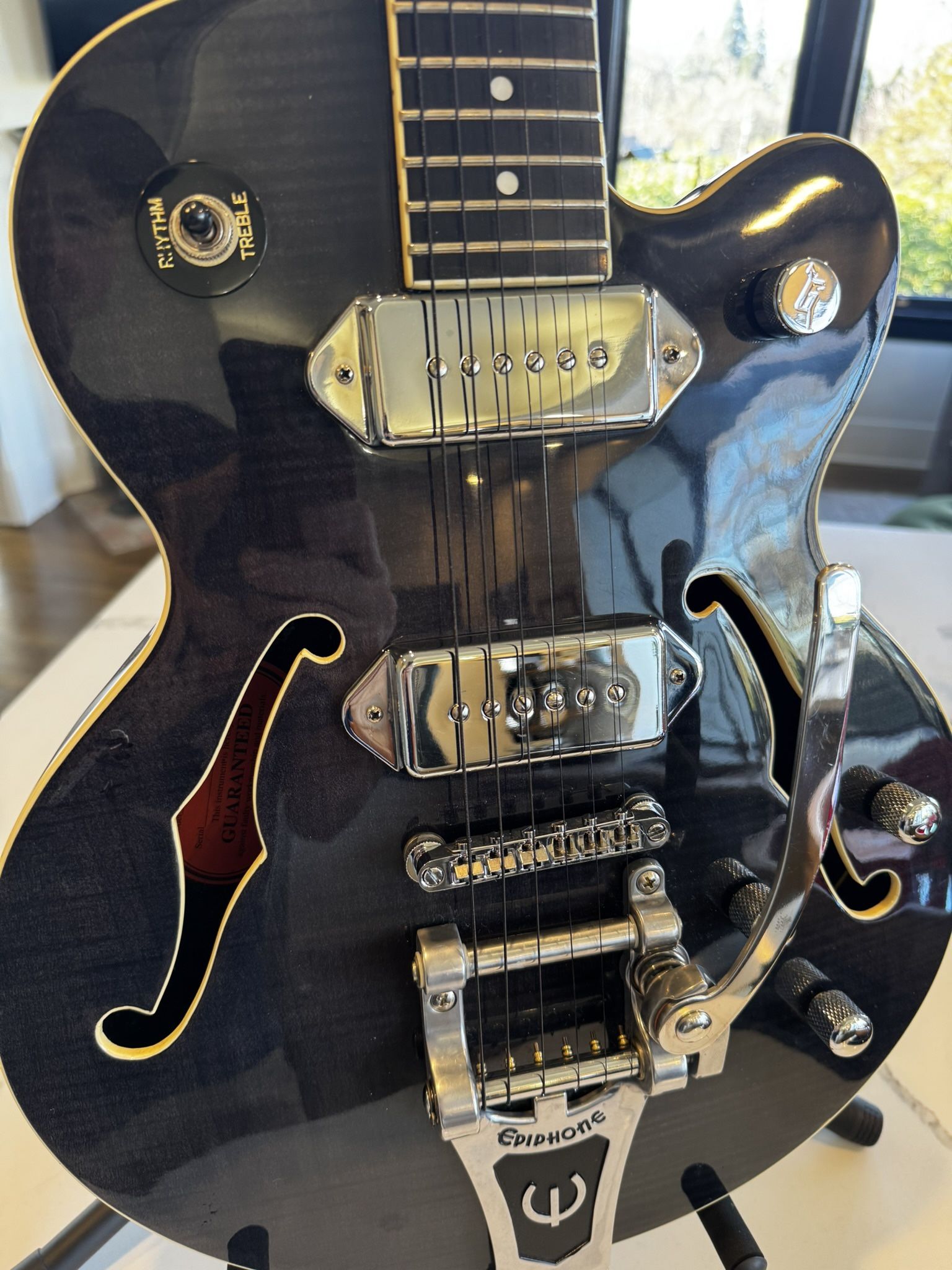 This Epiphone Wildkat has a semi-hollow body with a Bigsby, P90 pickups, master volume, and tone adjustments. This one is midnight black and in great condition Gibson Ibanez Taylor Martin fender Takamine Yamaha Breedlove Washburn Tacoma Alvarez