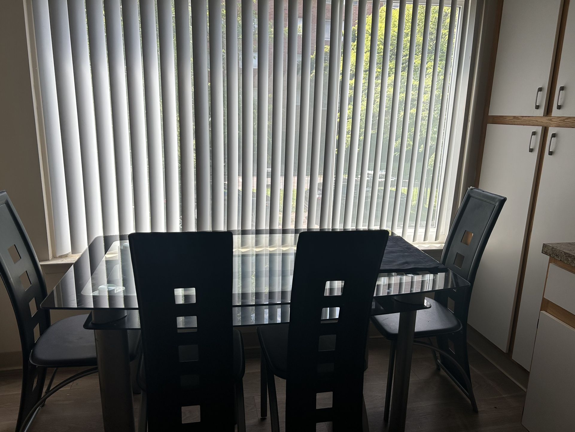 Comes with all four black chairs. Some wear on the chairs but overall good condition. Minor scratches on glass. Negotiable. I can work with you. Please see pictures. By purchasing this item you understand that there are normal signs of wear (slight scratches and small tears)