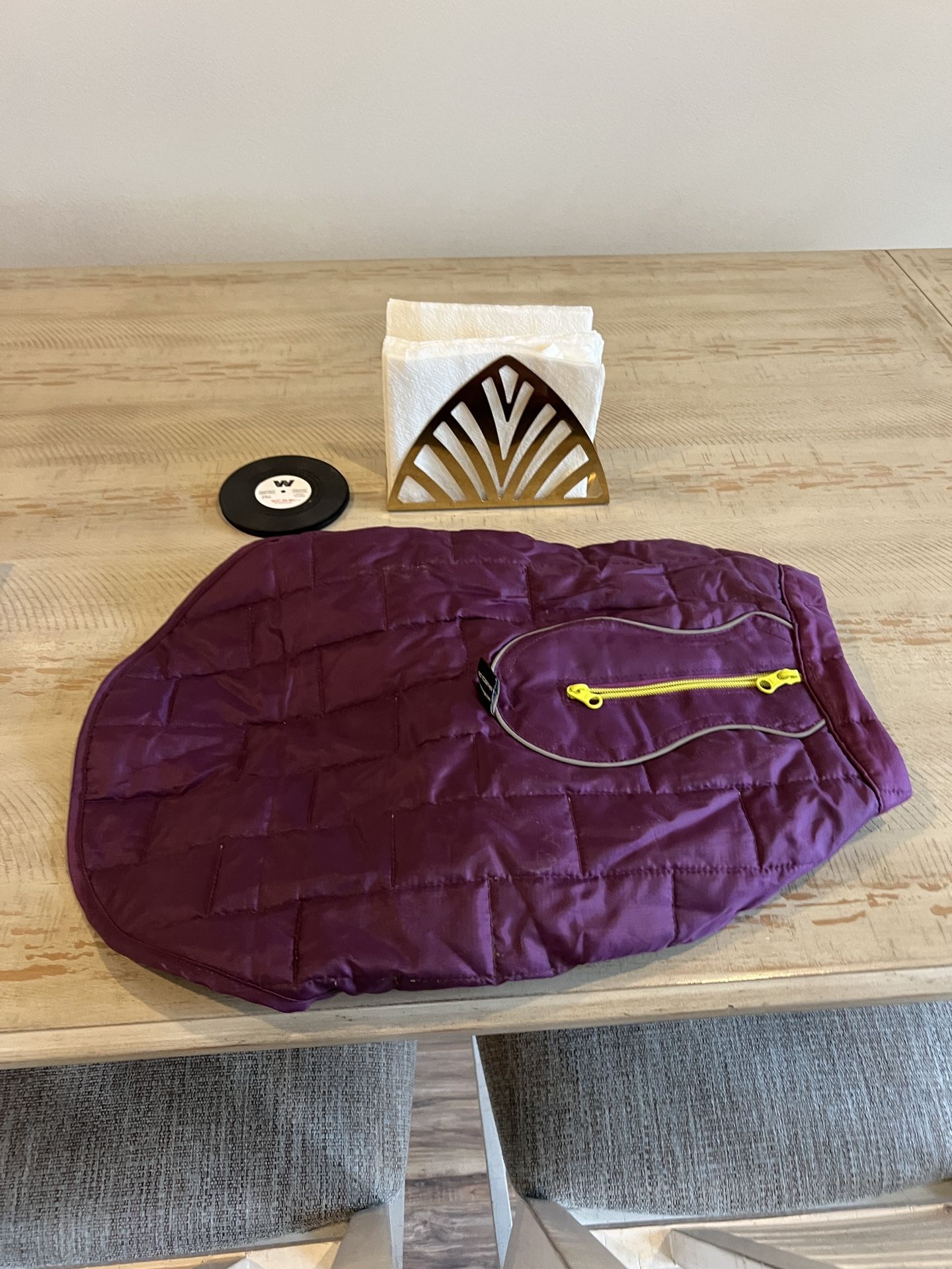 Purple dog rain vest. Size Medium. Used once. We don’t need it any more