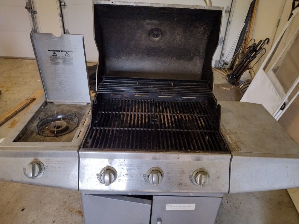 Three burners, one side burner and upper shelf. 1 year old grates. Cover included $45
