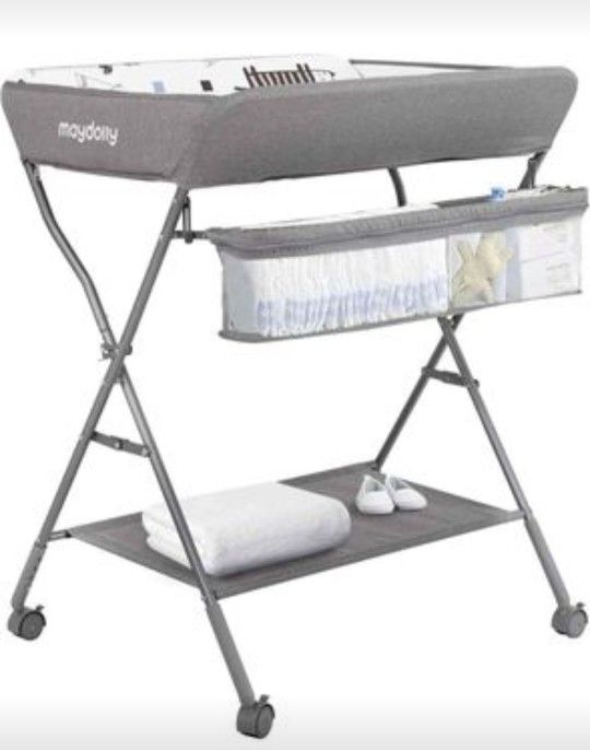 Baby Changing Table with Wheels, Maydolly Portable Adjustable Height Folding Diaper Station with Nursery Organizer & Storage Rack for Newborn Baby and Infant (Light Grey