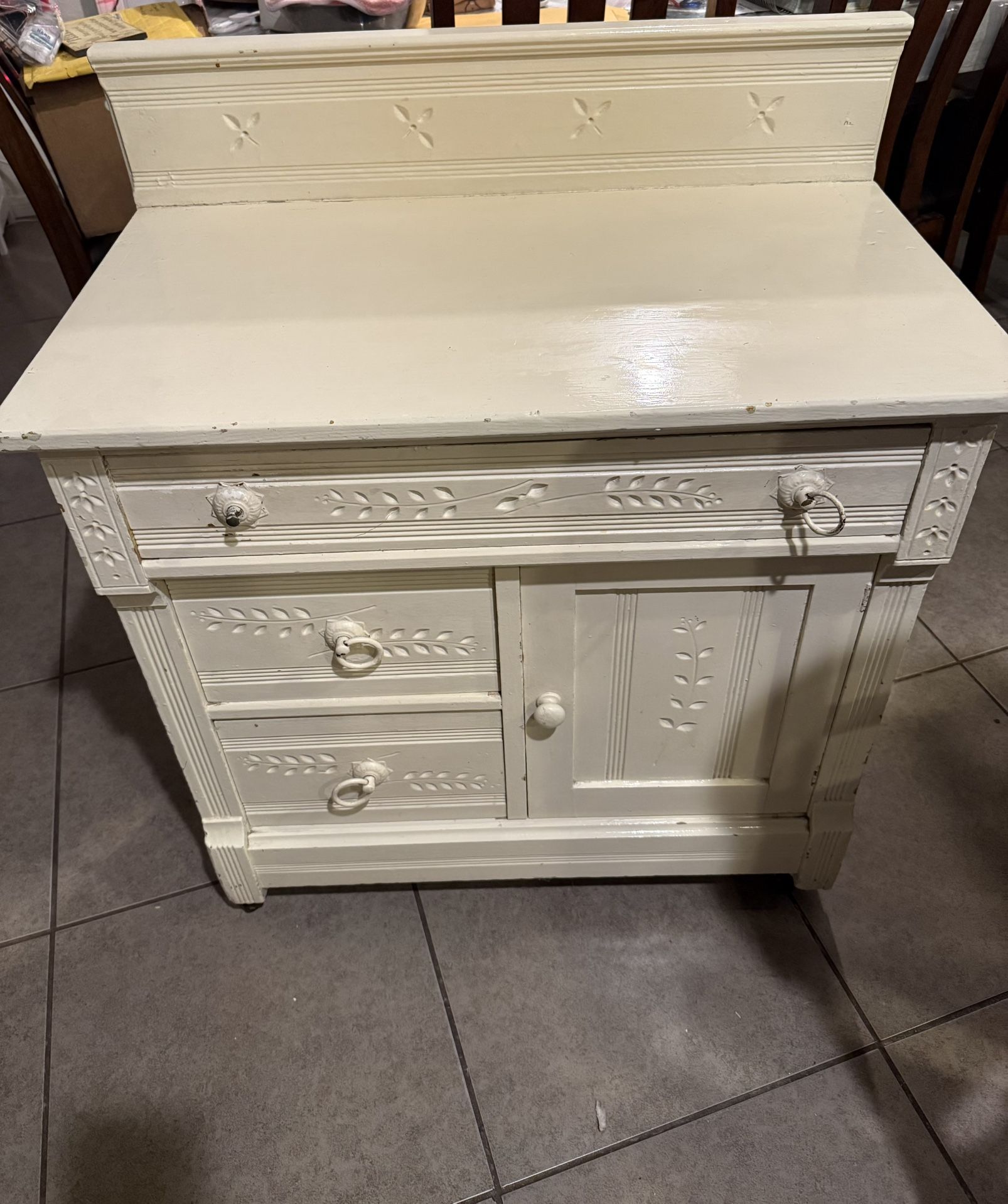 Vintage multi versatile furniture piece! Can be used for several purposes(entry table, nightstand, hallway piece) great project for someone that wants to sand it down and repaint it or great the way it is! Solid wood! Measurements in the pictures. One knob came off but I still have the original seen in pics… you can easily replace them with new knobs for a facelift :)