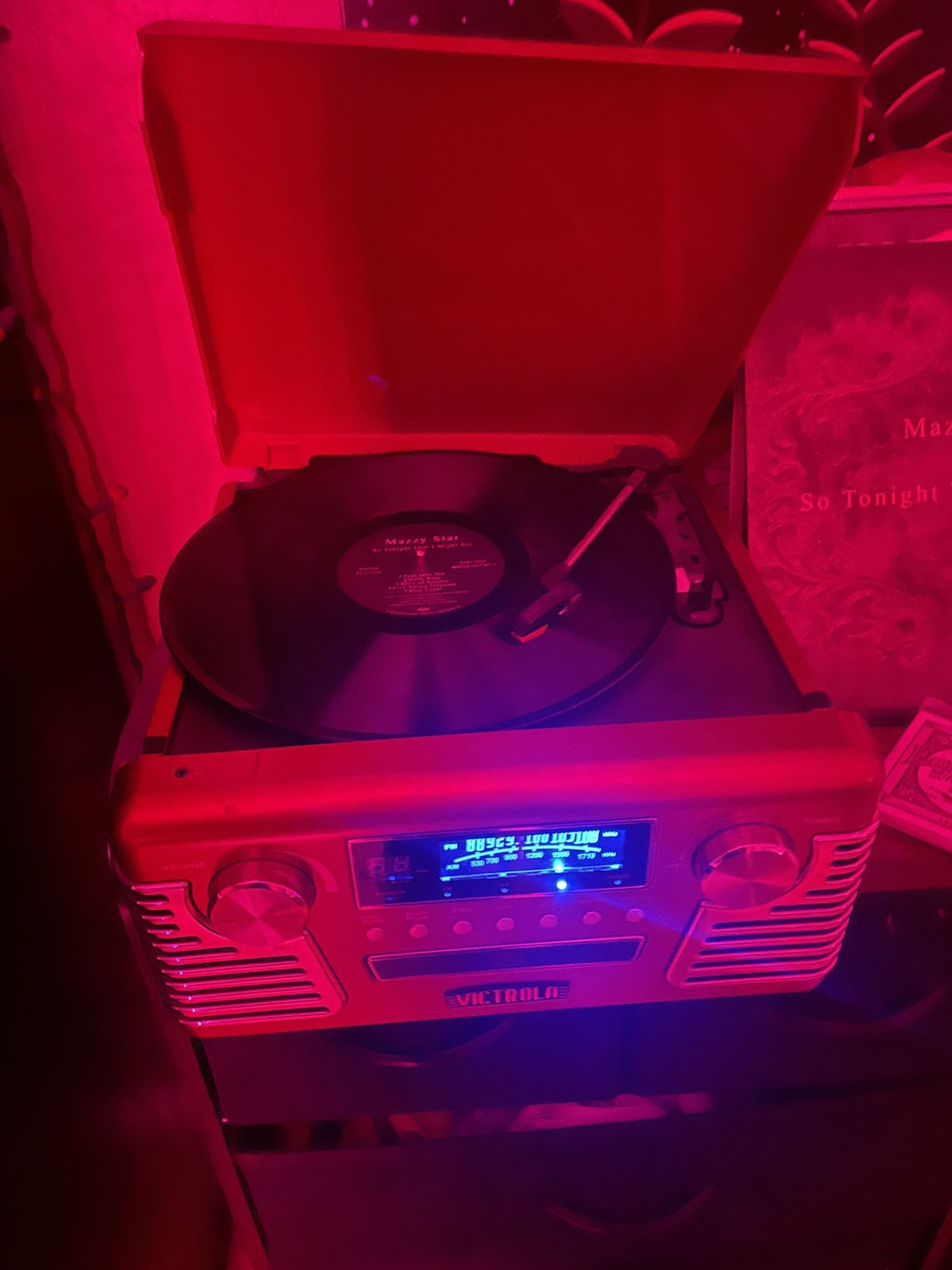 PRICE IS NEGOTIABLE. Red Victrola record player. Built in speakers, CD player, AM/FM radio. Message for more information!!