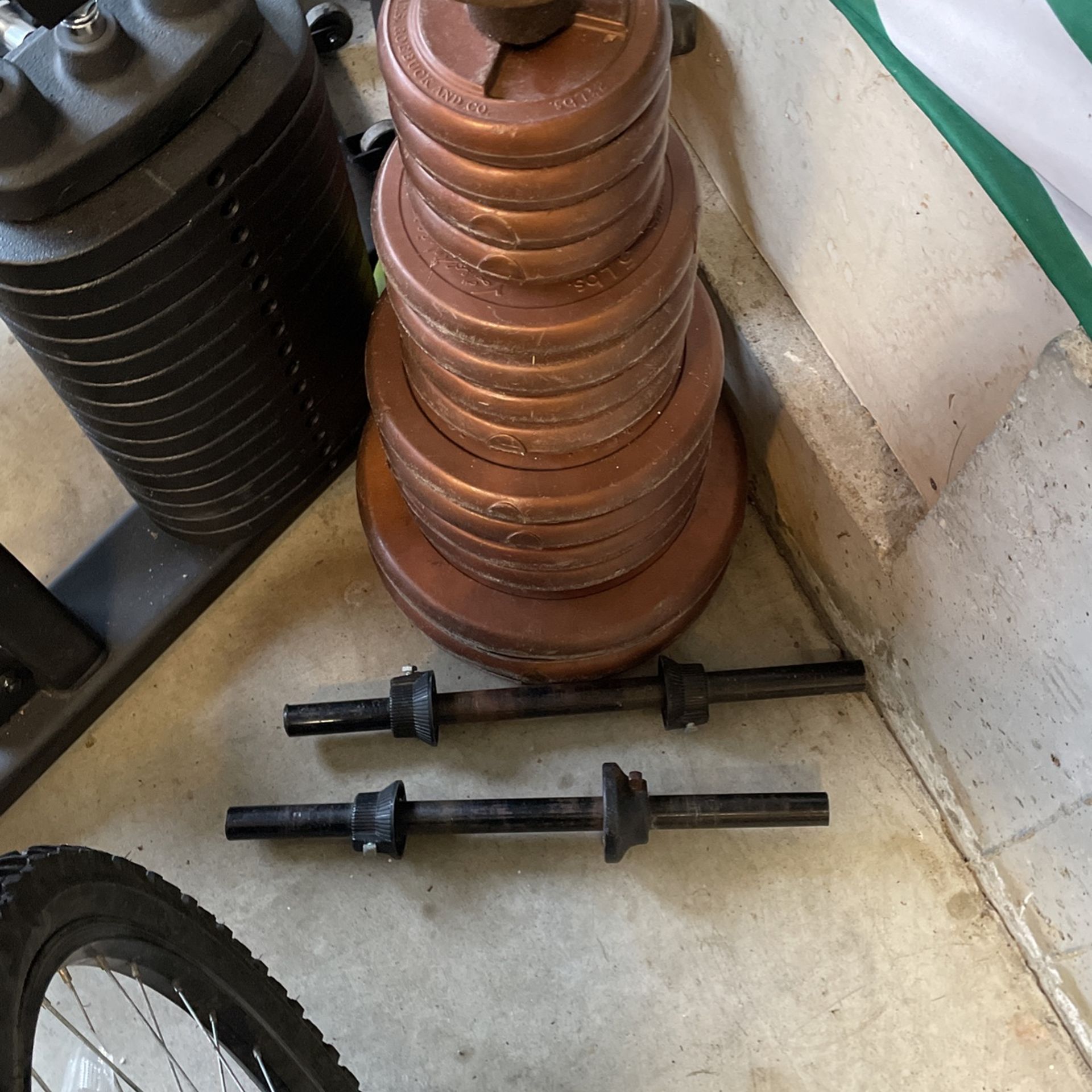 Weights 25’s 10’s 5’s 2’s and curl bar and bars for dumbbells. 150 obo