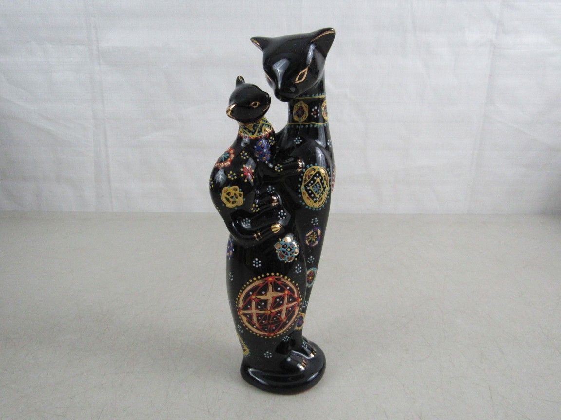 Ceramic Hand Painted Black Multi Colored Mom Cat & Kitten-8 3/4" Tall
