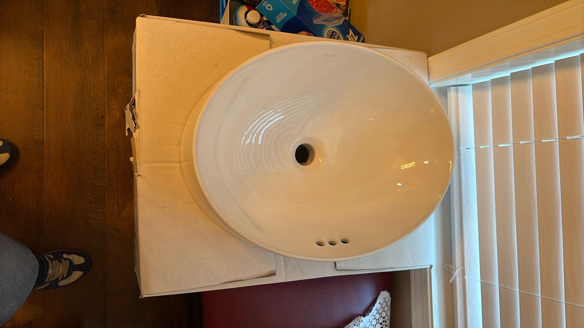 Kohler oblong sink is 21” in diameter and 4.5” in height. Faucet must be at least 5” in height. Color is white.