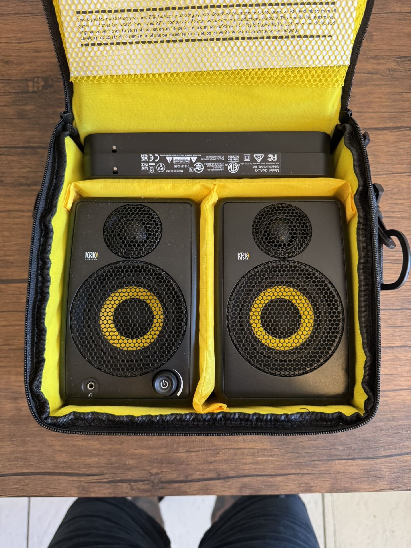 Practically new. I bought them a few months ago and used them like 3 times. Small speakers, their high is about 6.5”, so great for traveling. Great sound as well. It also connects to Bluetooth so you can connect your phone and play music. Includes power cable and cable to link both speakers. Red and white audio output cable does not come included.