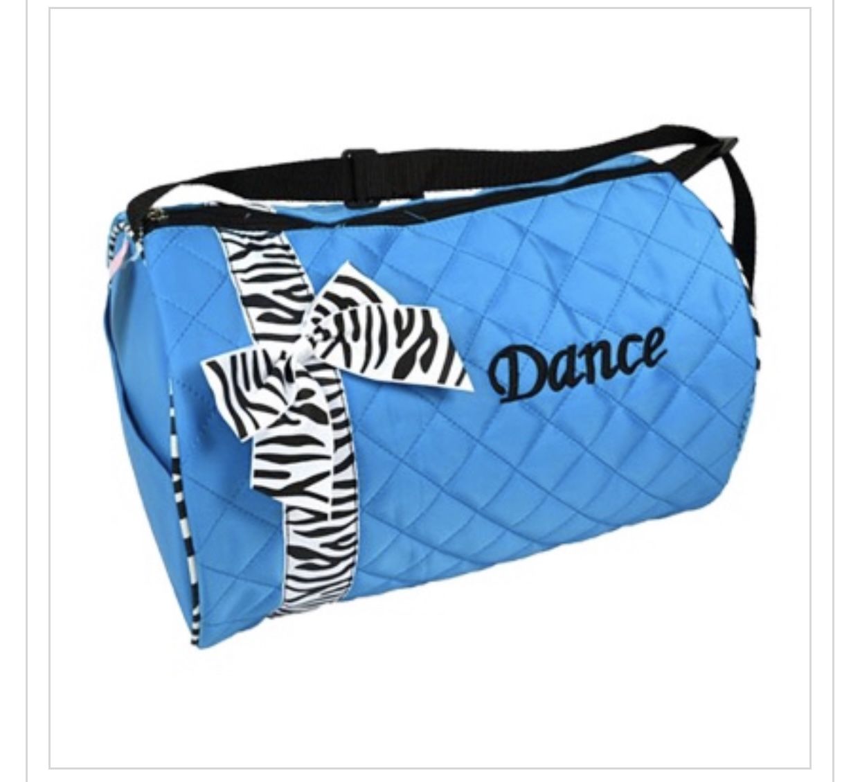 An all around duffel dance bag Quilted nylon fabric with “Dance” embroidery 9X13 Adjustable shoulder strap with two outside pockets- 1 nylon & 1 breathable mesh Zipper enclosure & interior zippered pocket New with tag in plastic