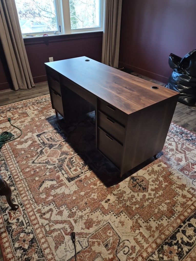 PRICE FLEXIBLE: NEEDS TO GO Sauder Clifford Place 59"W Mid-Century Executive Computer Desk, Grand Walnut Desk is: 23 7/16ths D 59 1/16ths W 30in H Desk is heavy. We are happy to help move it to your vehicle, but have help when you get home!