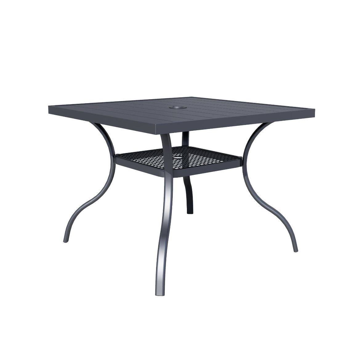 Product Details: Material: Metal Steel with E-coating UV Resistant and Waterproof Table Size: 37"L x 37"W x 28"H Diameter of umbrella hole: 1.57" Color: Black Shape: Square Suitable for 4 people Assemble Time: 15 minutes Ideal for Patio, Garden, Lawn, Backyard, Poolside, Yard, Porch, Deck, Balcony, Courtyard