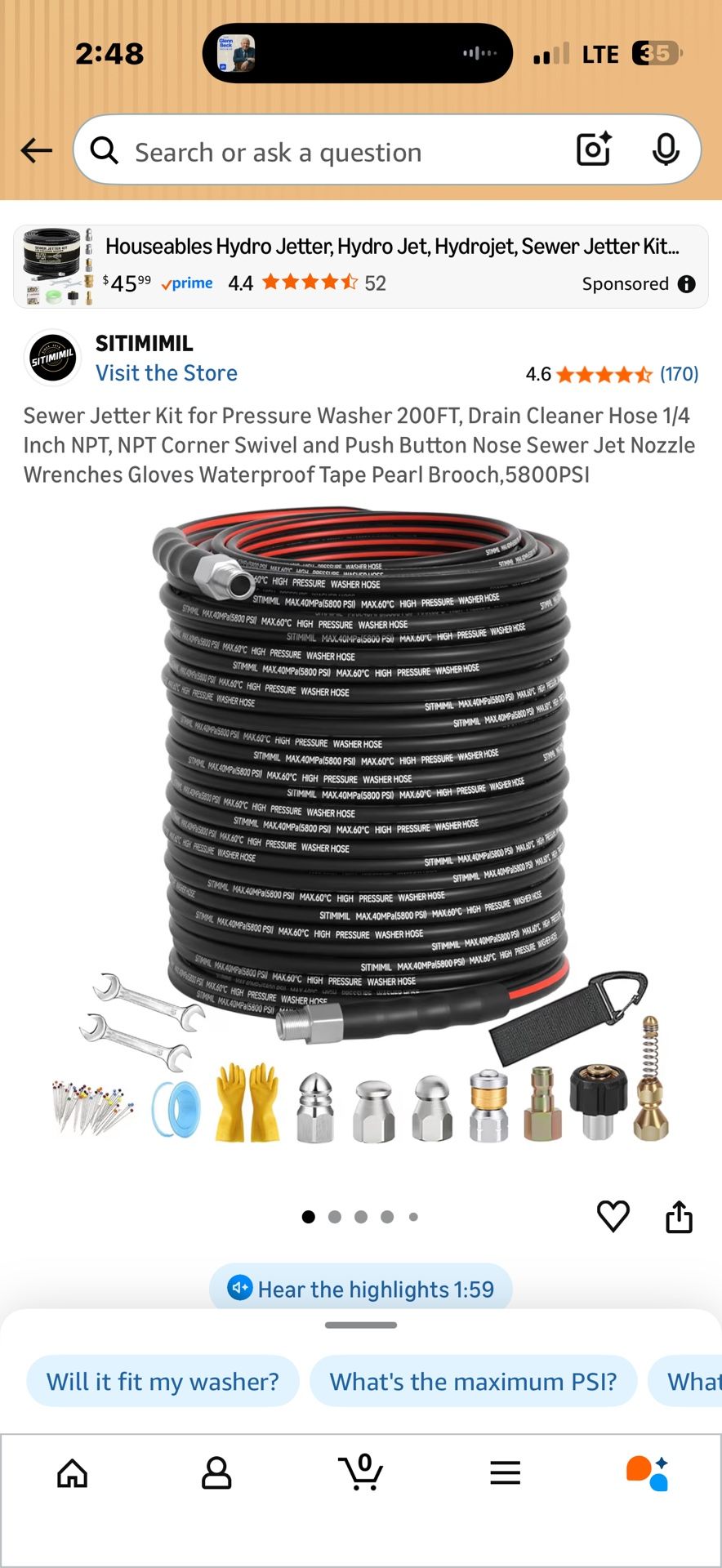 New 200 ft pressure washer sewer jetter kit with 5 nozzles accessories