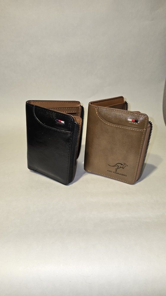 These are leather wallets, that have zippers to securely hold your money, credit/debit cards and I.D. This wallet has 8 pockets for credit/debit cards, an I.D. holder and horizontal feed pocket for a total of 10 pockets. This wallet is made from Genuine Leather. This wallet once purchased will leave you with some money to put in it.