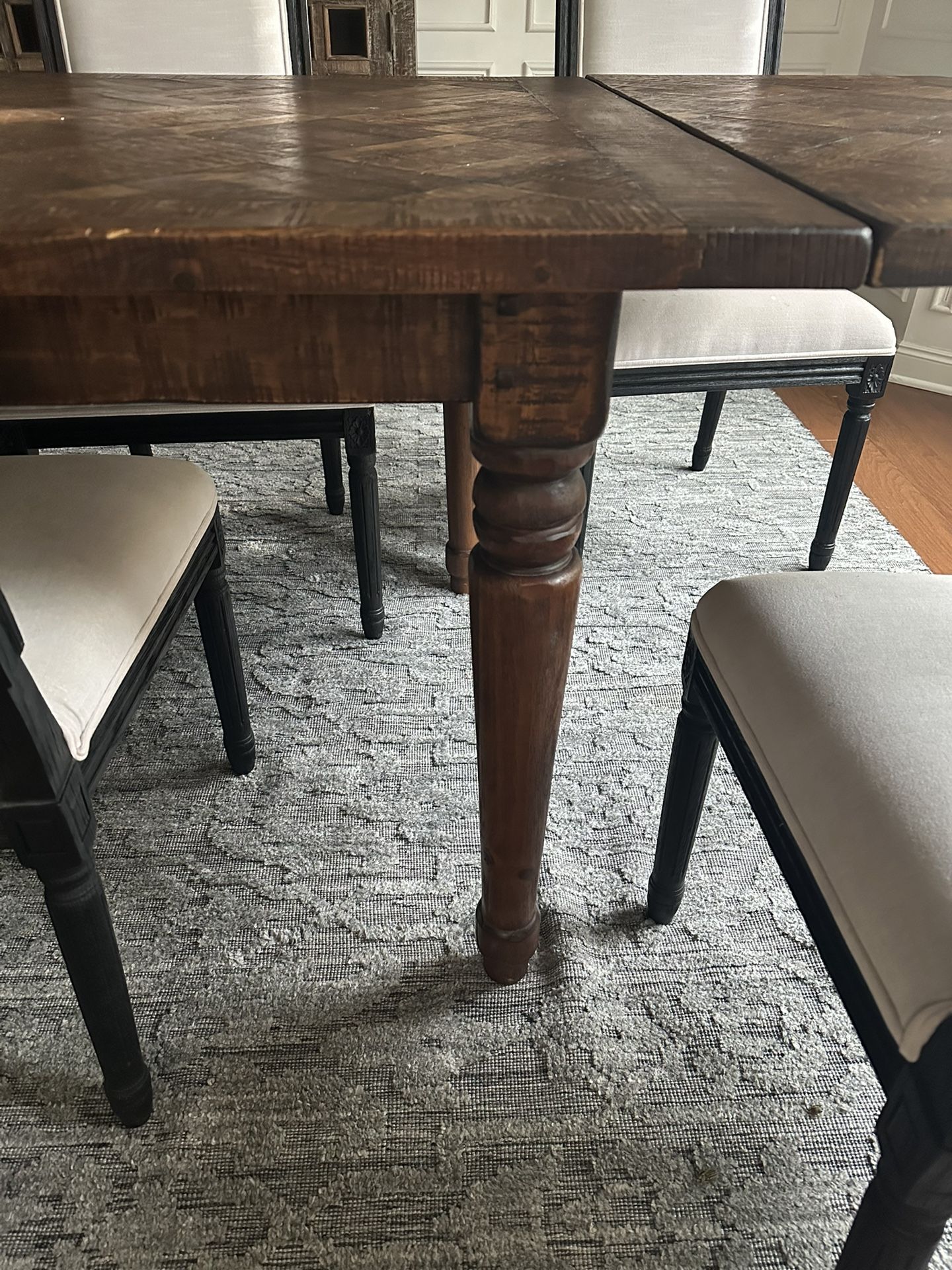 Extends with two leaves. 110 extended or 75 without . Fits up to 10 comfortably