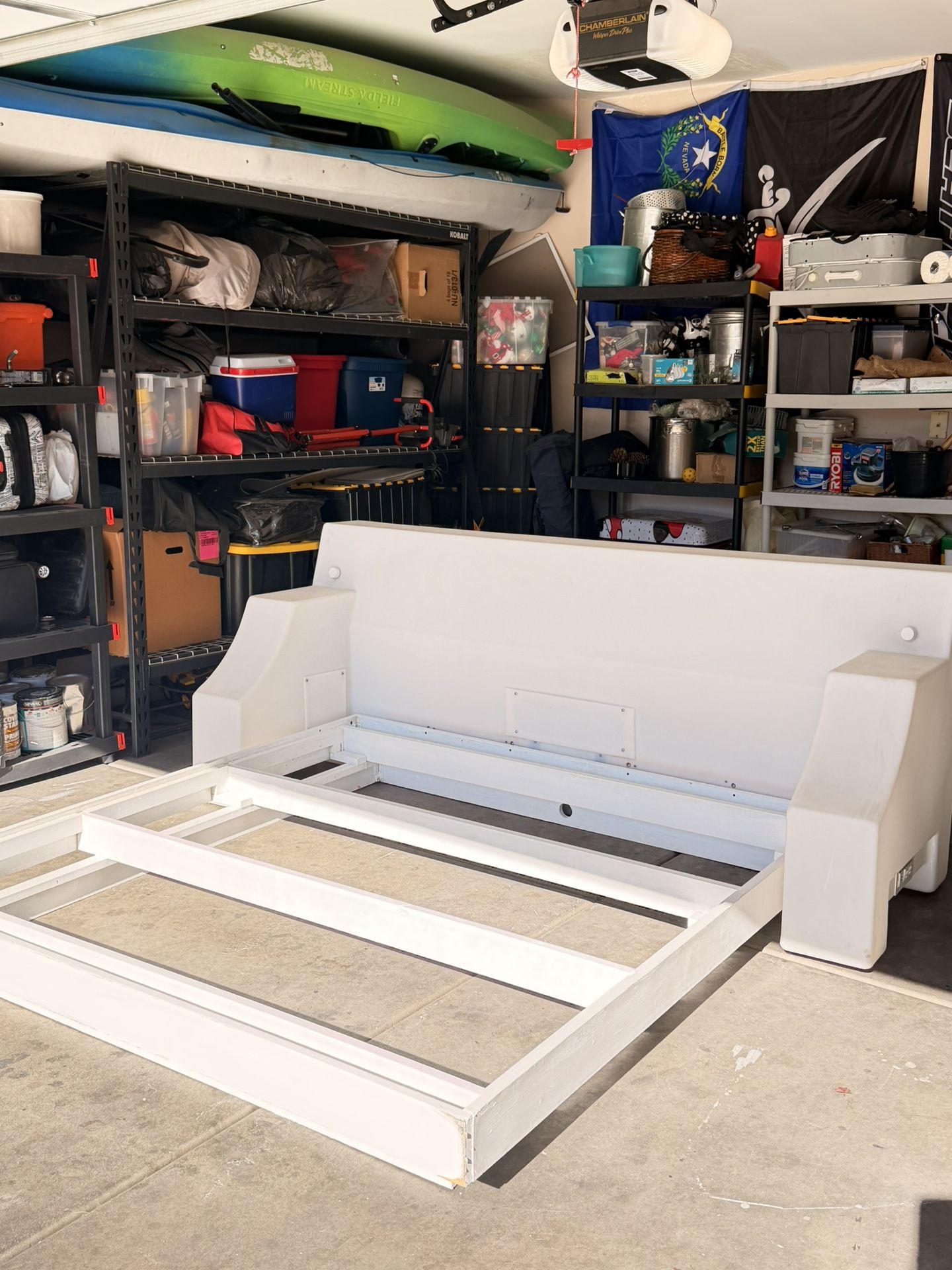 Light up head board with bed frame with a charging port located on the side of the head board. Each side can be detachable sofa includes pillows and cushions and light control to dim lights high or low as shown.