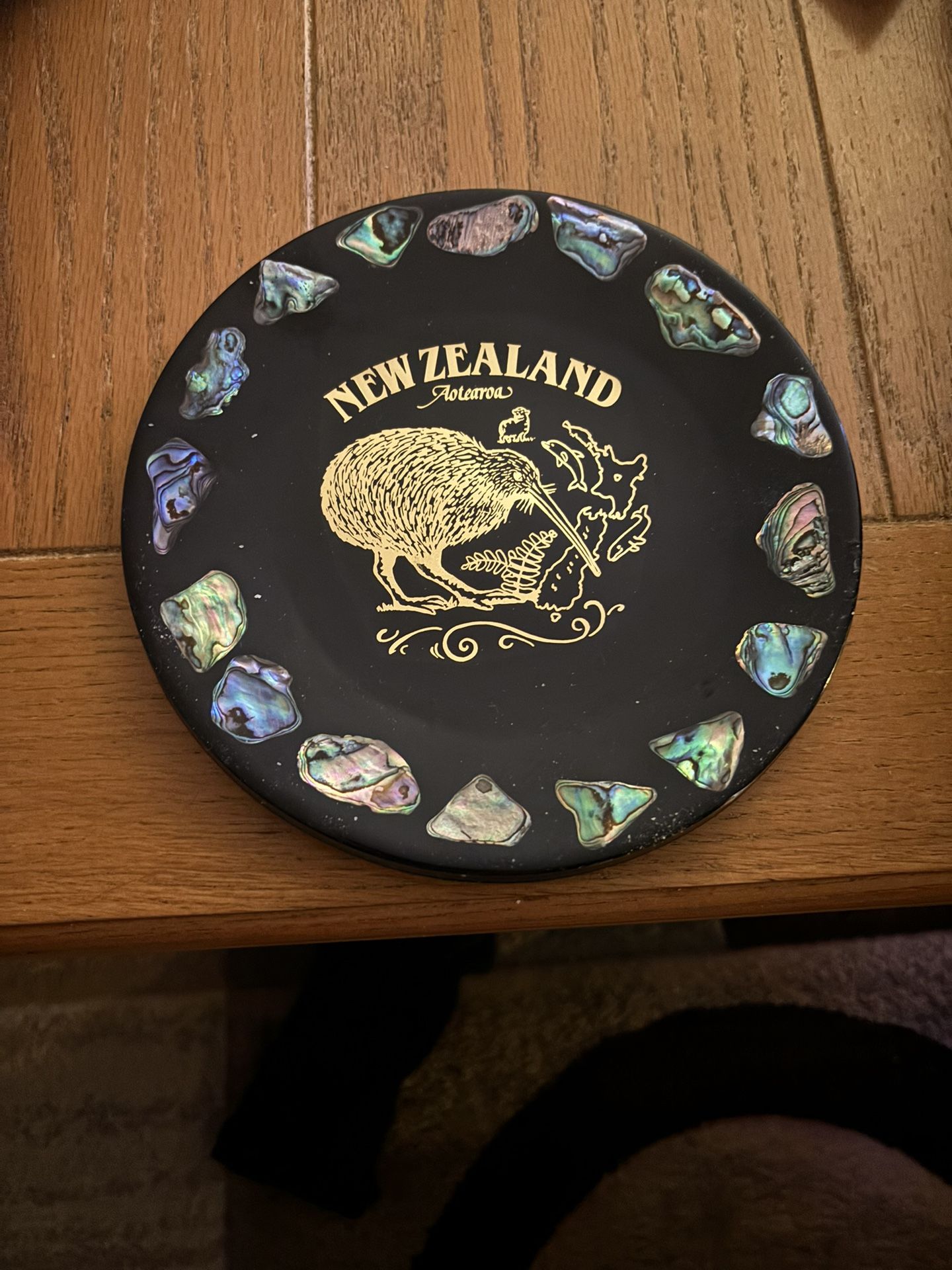 Vintage New Zealand kiwi bird collector plate …7 inches in diameter, felt bottom, gold kiwi bird surrounded by mother or pearls. $23 on a 1-10 condition scale… it’s a 9.5