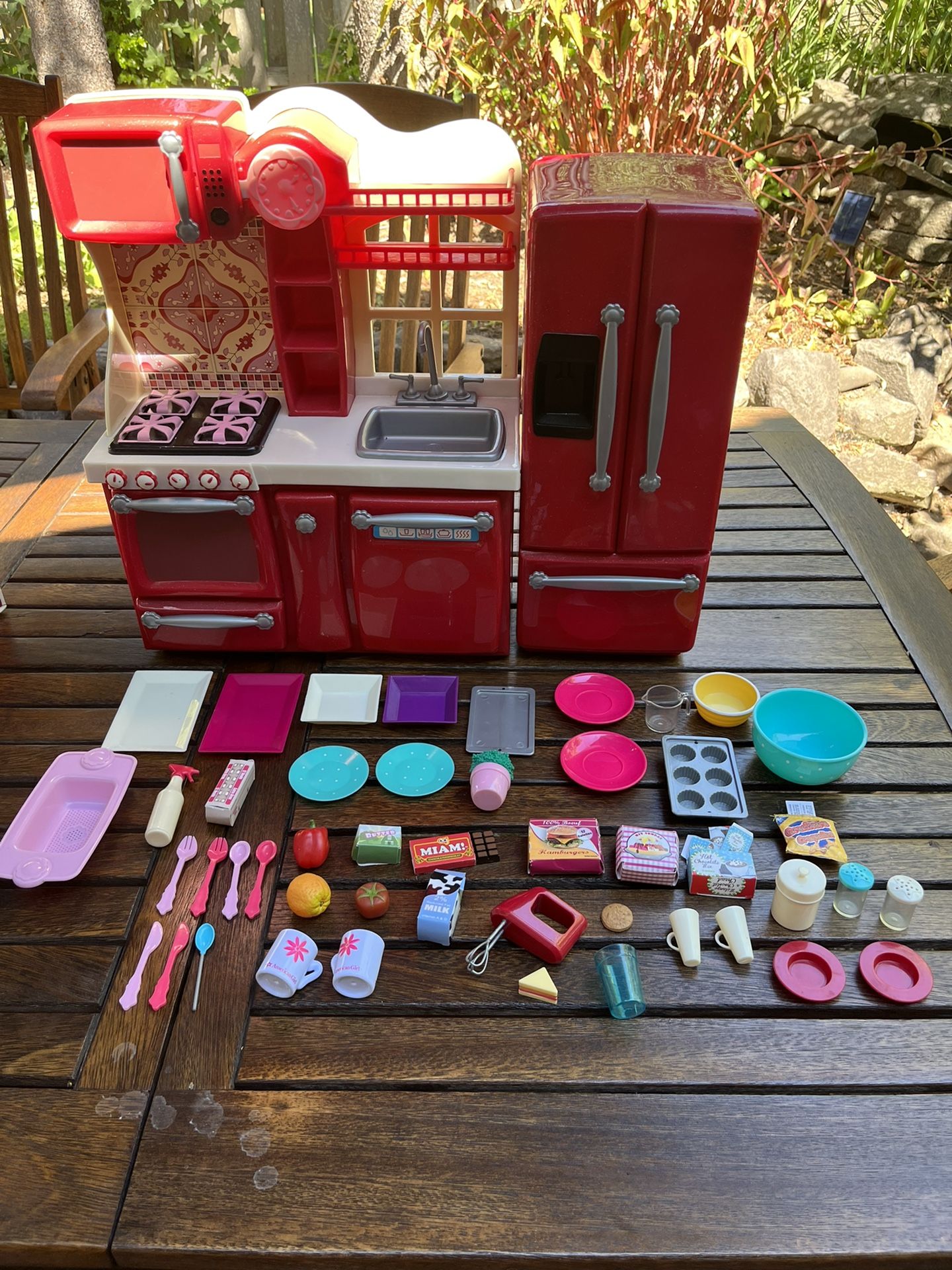 An amazing kitchen set that includes food, plates, cups, silverware, decoration, fridge, and kitchen set! In great condition perfect for American girl dolls and 18” dolls!