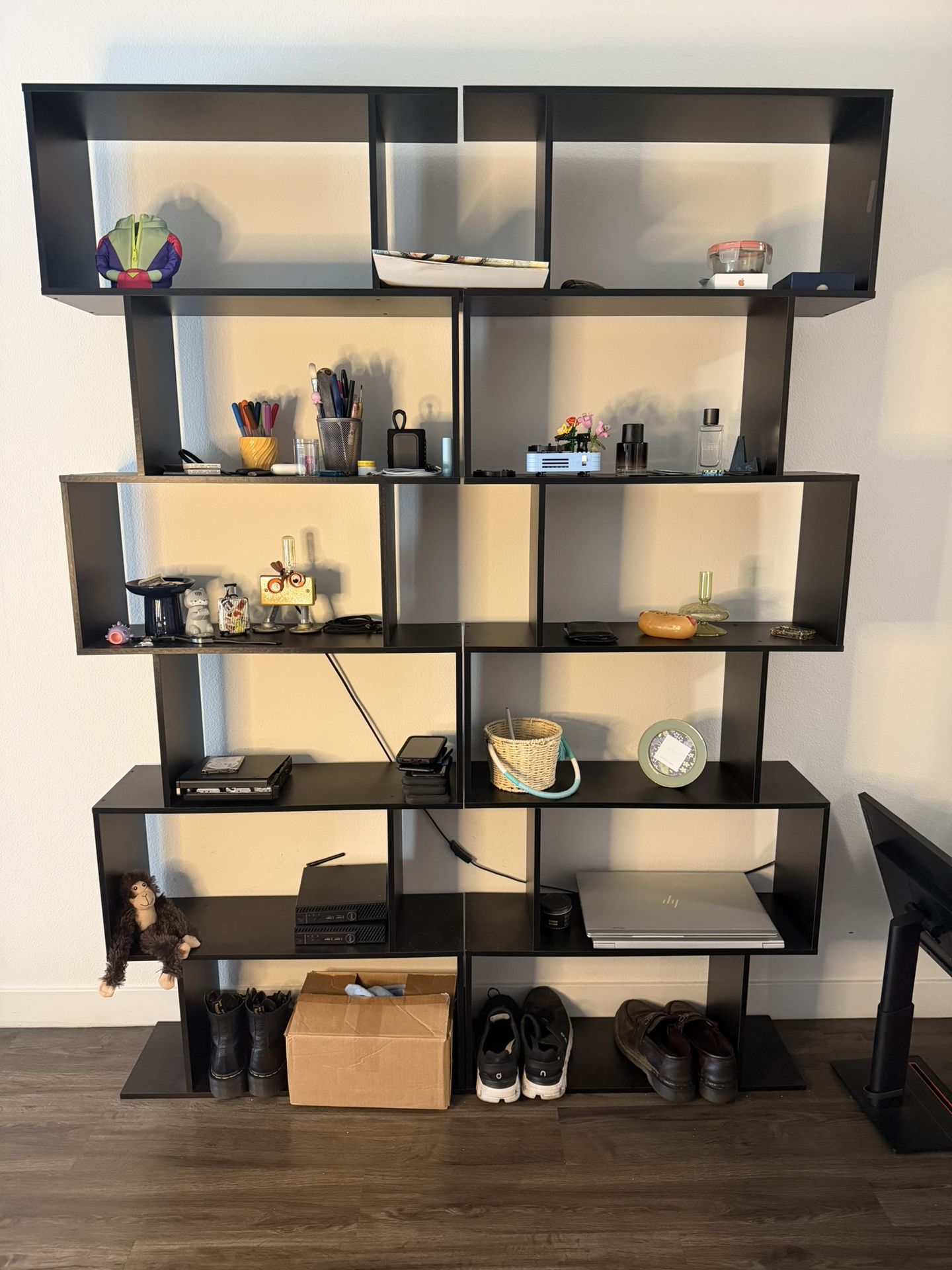 Modern Black Cube Shelf Unit (2 Combined) – Great Condition Selling a stylish and functional shelving unit made from two matching cube shelves combined into one large piece. The asymmetrical design gives it a modern look while offering plenty of storage and display space.