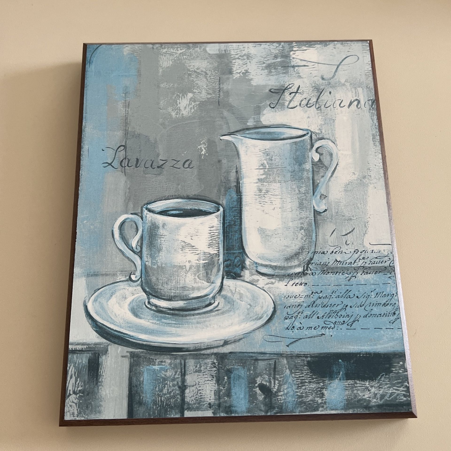 8 x 10 coffee photo for hanging. Colors are blue and gray. Porch pick up. Five dollars. Perfect condition just changing my kitchen colors.