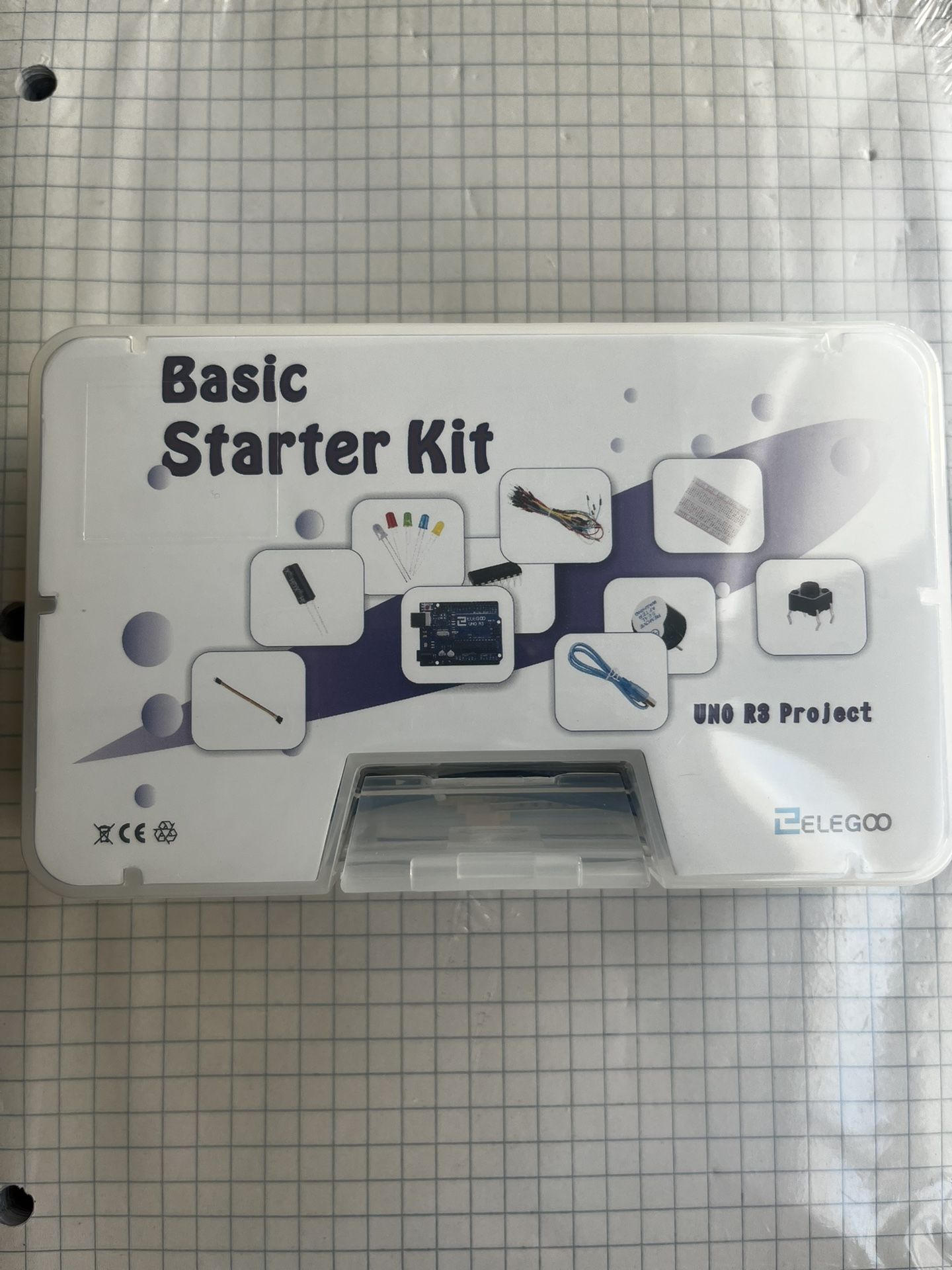 ELEGOO UNO R3 Project Basic Starter Kit. It is an electronics kit designed for beginners to learn about programming and electronics. The kit includes an ELEGOO UNO R3 controller board, which is compatible with the Arduino IDE. It comes with a variety of components, such as LEDs, resistors, a breadboard, and jumper wires, to help users build different projects.
